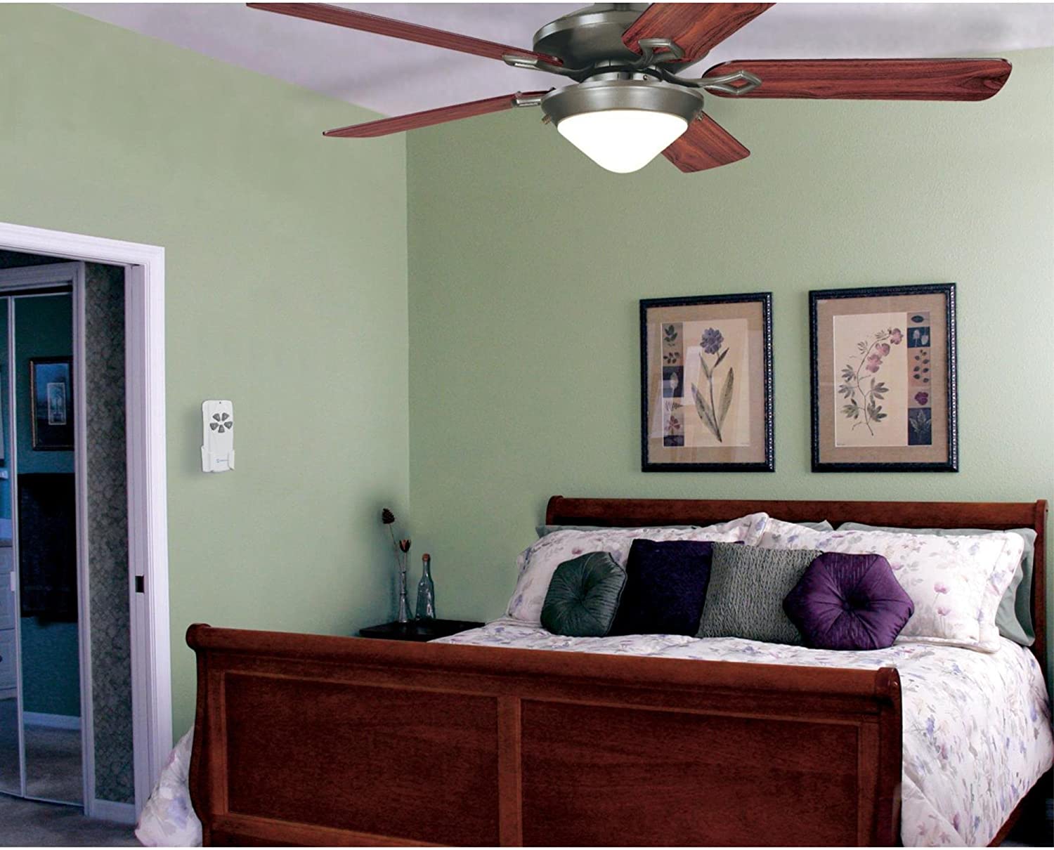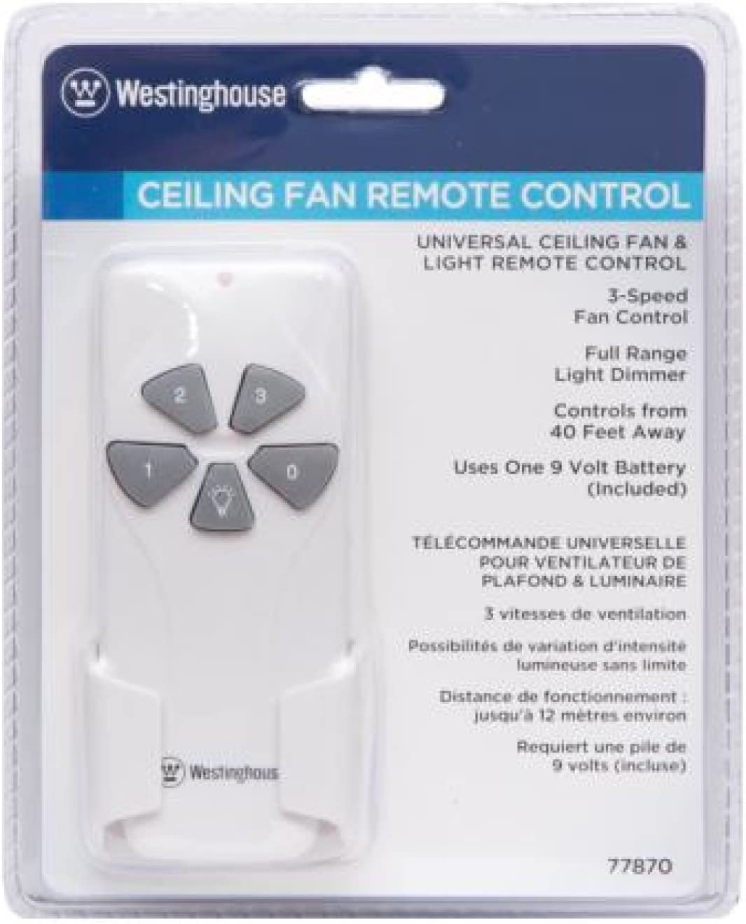 Hand-held remote control provides 3-speed fan control and variable light dimming. Operates up to a distance of 40'. Compact design conceals in fan canopy, installs easily on any new or premounted ceiling fan. Adjustable frequency setting eliminates interference. Silent operation. Wall mounting bracket included. Uses one 9V battery (included). UL listed.