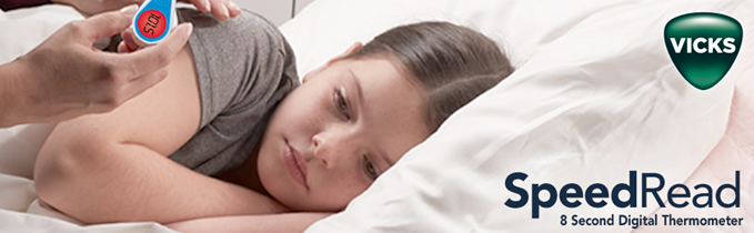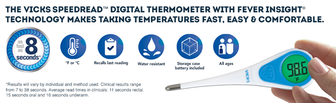 Get temperature results quickly and easily, when you need them most. The Vicks Speed Read Digital Thermometer (V912US) provides accurate readings within +/- 0.2 degrees F in only 8 seconds. The unique Fever InSight helps you get temperature readings at a glance with a color coded display, and understand them easily. A green display suggests a normal temperature, yellow signifies an elevated temperature and a red display indicates a high temperature Because it can be used as an adult thermometer for oral readings as well as be used a rectal thermometer for babies or even used under the arm for toddlers and kids, it’s perfect for the whole family. It also has a memory feature that recalls and displays last temperature taken, an automatic shut-off for longer battery life and is waterproof for easy, thorough cleaning. Plus, this temp thermometer includes a storage case, battery and has a limited 1 year warranty.