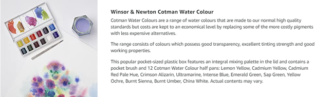 • Winsor & Newton Cotman Water Colours are a range of water colours that are made to our high quality standards but costs are kept to an economical level by replacing some of the more costly pigments with less expensive alternatives.