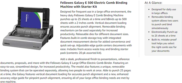 The high performance Fellowes Galaxy E Comb Binding Machine features effortless electric operation for large offices. Punches up to 25 sheets at the touch of a button and binds up to 500 sheets with a 2 Inches comb. Vertical document loading ensures accurate punch alignment. Removable binding mechanism can be used separately for increased productivity. Releasable dies for different document sizes. Features built-in comb storage tray with integrated document measurement device for added convenience and quick set-up. Adjustable edge guide centers documents with ease. Includes front-access waste tray and binding starter pack (contents: 20 pack assorted kit).