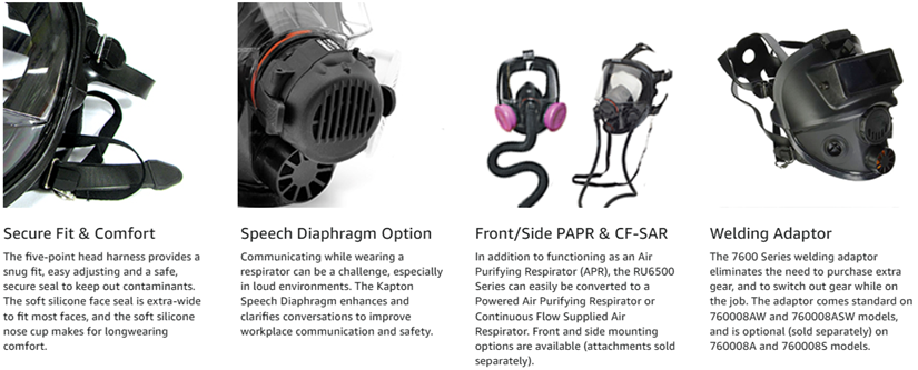 | Special Features | Cartridges and filters sold separately, Safety Products, Can be adapted to PAPR or Supplied Air| Also available with a welding attachment. | Speech diaphragm is standard| Dual flange sealing area| Five strap head harness| Nose cup is standard| Chin cup helps to position the facepiece properly| Latex free. | Lens offers 200o field of vision, plus downward view| Polycarbonate lens meets ANSI high impact requirements |