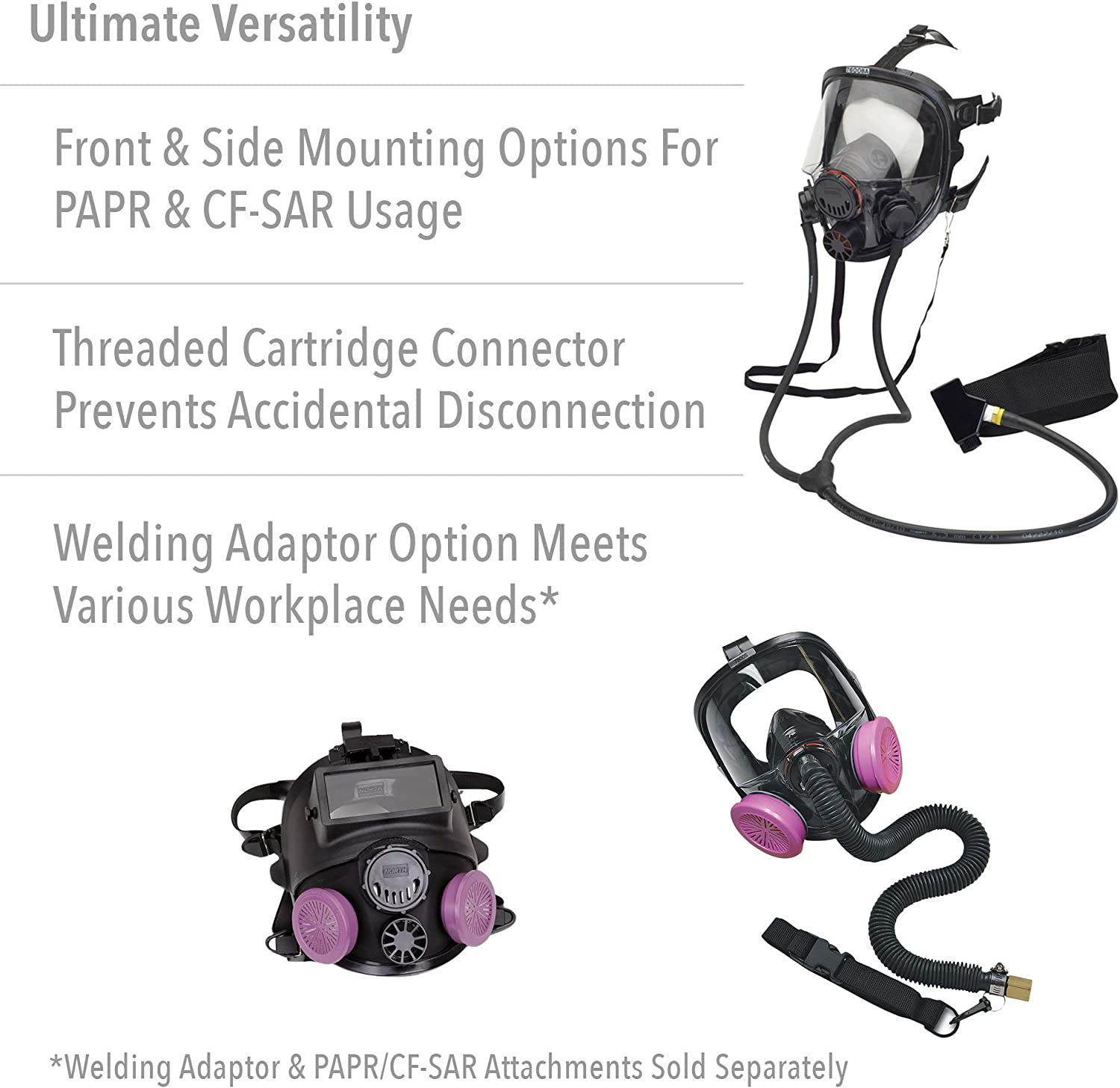 This Honeywell North 7600 Series Full Facepiece Silicone Respirator offers premium safety, comfort and performance. It delivers strong protection against particulates, dusts, fumes, mists, organic vapors, acid gases & other contaminants, and is compatible with our full range of cartridges, filters & cartridge/filter combinations to suit almost any work environment. In addition to functioning as an air purifying respirator (APR), the 7600 model also features front and side mounts for easy transition to a powered air purifying respirator (PAPR) or a continuous flow supplied air respirator (CF-SAR). A welding adaptor is also available, which eliminates the need to purchase extra gear and to switch out gear while on the job (adaptor not included). The full face respirator features a soft silicone nose cup for longwearing comfort on the job. The silicone face seal provides an excellent contaminant barrier, and the threaded cartridge connector prevents accidental disconnection. A five-point head strap option includes a center strap for quick adjusting and a more secure fit. The tough polycarbonate lens offers a wide sightlines, downward viewing, optical clarity and distortion-free vision. The ANSI-Approved lens is designed to withstand high impacts, eliminating the need for additional eye protection. Suitable for use as a paint respirator, paint spray mask, welding respirator, chemical mask and other applications.