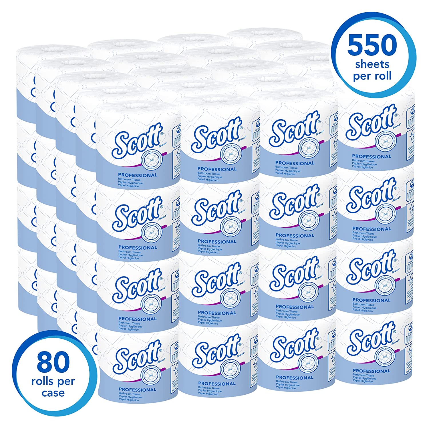 550 Sheets/Roll, 80 Scott Professional Standard Roll Toilet Paper Rolls/Case; 44,000 Sheets/Case; 2-Ply; White; Individually wrapped rolls; with Elevated Design