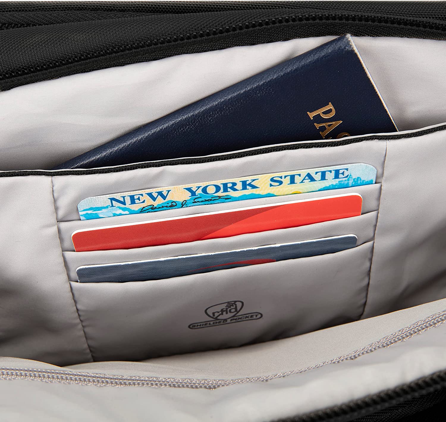 RFID blocking card and passport slots and external smart phone pocket