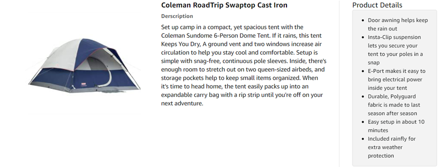 | Included Components | Coleman Tent 12X10 Elite Sundome 6 Person with LED Lighting |