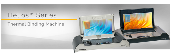 Ideal for frequent use in large offices, the Fellowes Helios 60 Thermal Binding Machine features an auto document thickness detector with auto-binding cycle that selects thermal binding settings for the user. Binds documents up to 600 sheets in a single step. 1-3 minute thermal binding cycle with 4-minute heat-up time. Heat Shield safety barrier prevents accidental contact with the heating plate. Visual indicators signal when machine is ready for thermal binding and heat cycle begins once document is loaded. Ready-beep sounds when thermal binding cycle is complete. Internal clamps hold documents in place during thermal binding process. Auto shut-off safety feature prevents overheating. Stylish design folds flat for storage. For use with thermal binding covers only.