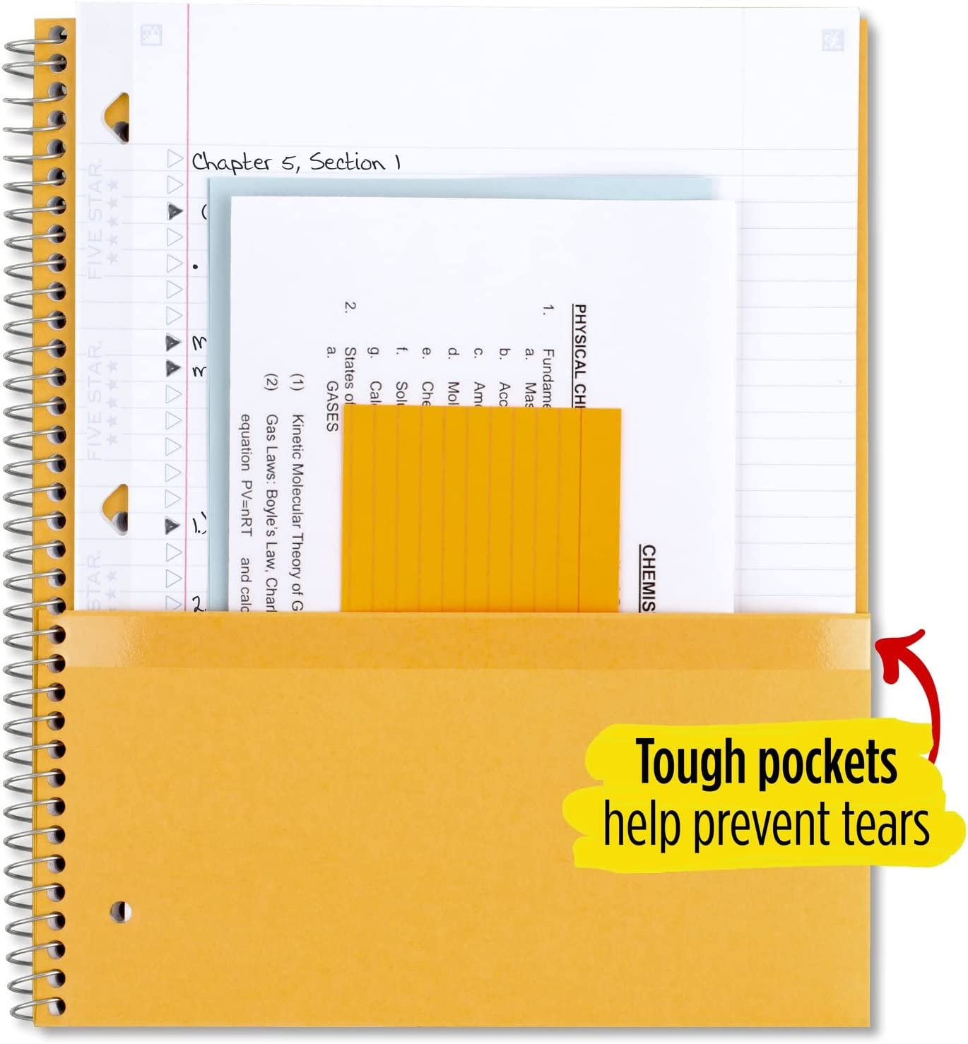 LASTS ALL YEAR. GUARANTEED!* This Five Star 3 Subject Notebook is full of features. Compatible with the Five Star study app, you can easily scan, study and organize notes on your phone! Create instant digital flashcards and sync notes to Google Drive and access them anywhere from any device. 3 subject notebook has 150 double-sided, college ruled sheets, which fight ink bleed. Sheets measure 8-1/2" x 11" and are perforated for easy tear out. Tough pockets help prevent tears and hold 8-1/2" x 11" loose sheets and handouts. Covers are water resistant to protect your notes and our Spiral Lock wire helps prevent snags on clothes and backpacks. Made with SFI certified paper. Notebook is recyclable – just remove the reinforcement tape on the pocket and recycle the rest! Available in Fire Red. *Guarantee is valid for one year from purchase date. Does not cover misuse.