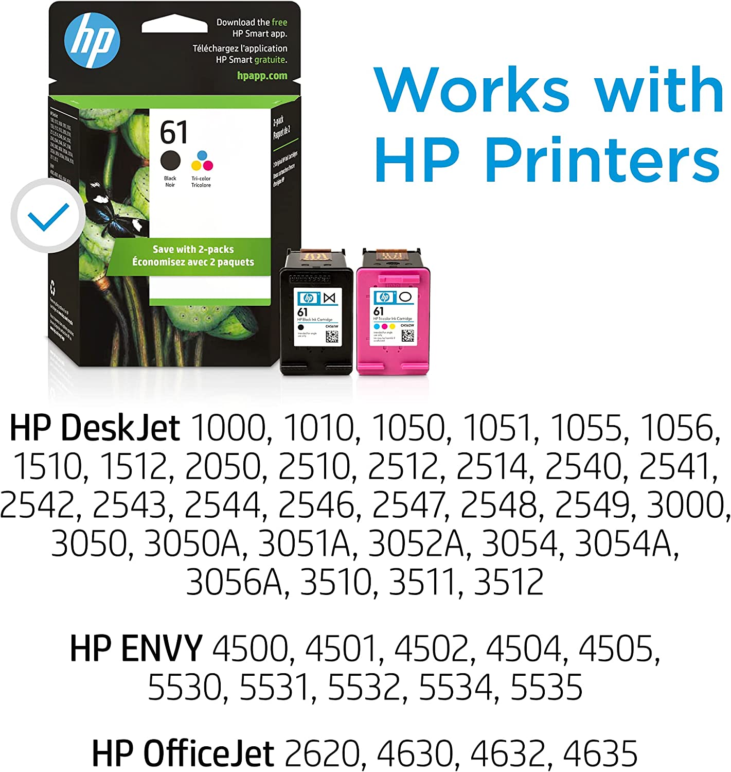 - What's in the box: 1 New Original HP 61 pack of 2 ink cartridges (CR259FN): 61 black ink cartridge (CH561WN), 61 tri-color ink cartridge (CH562WN)