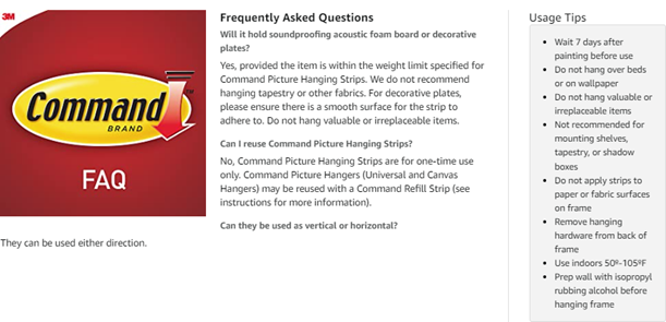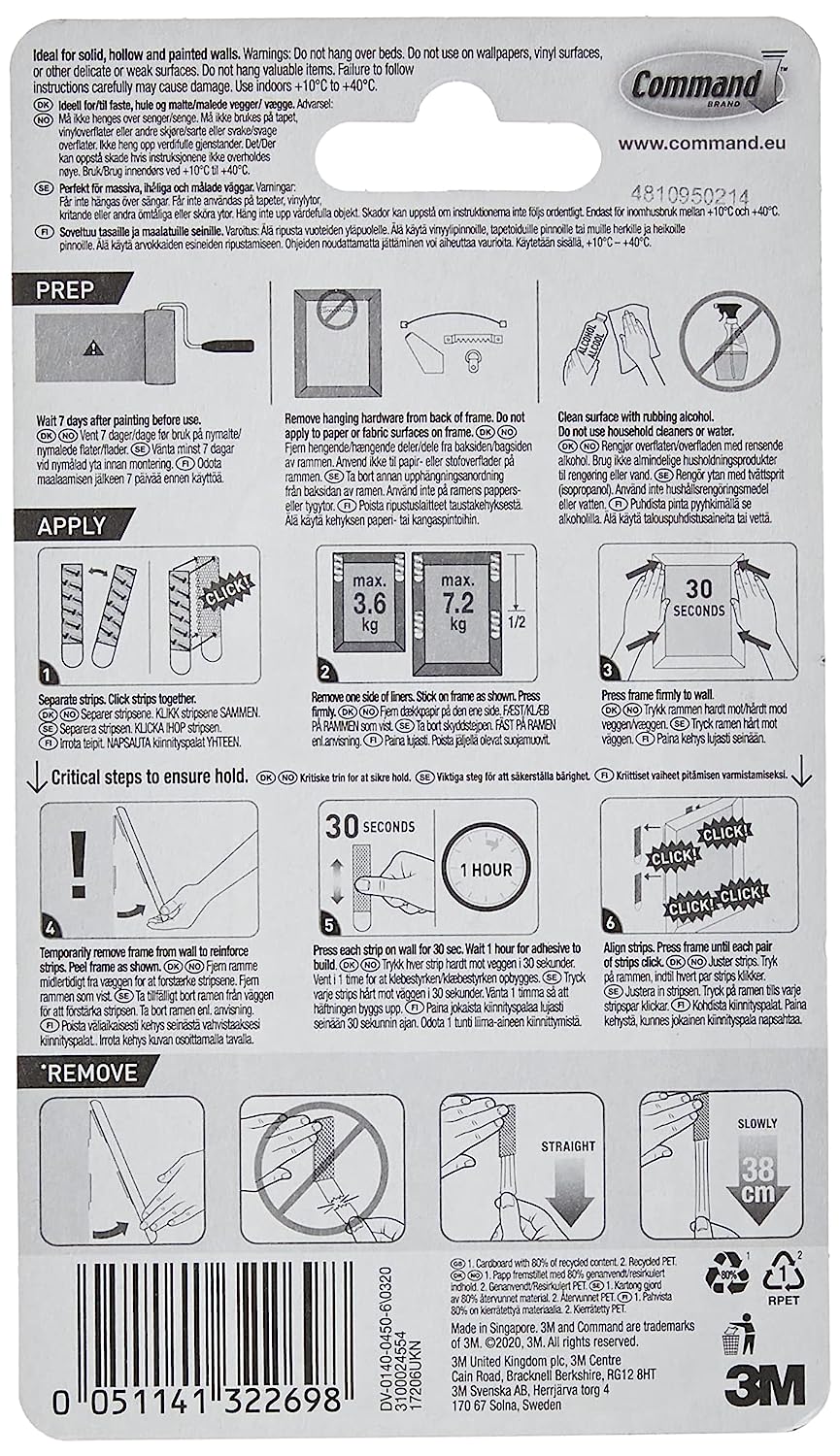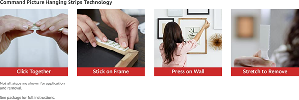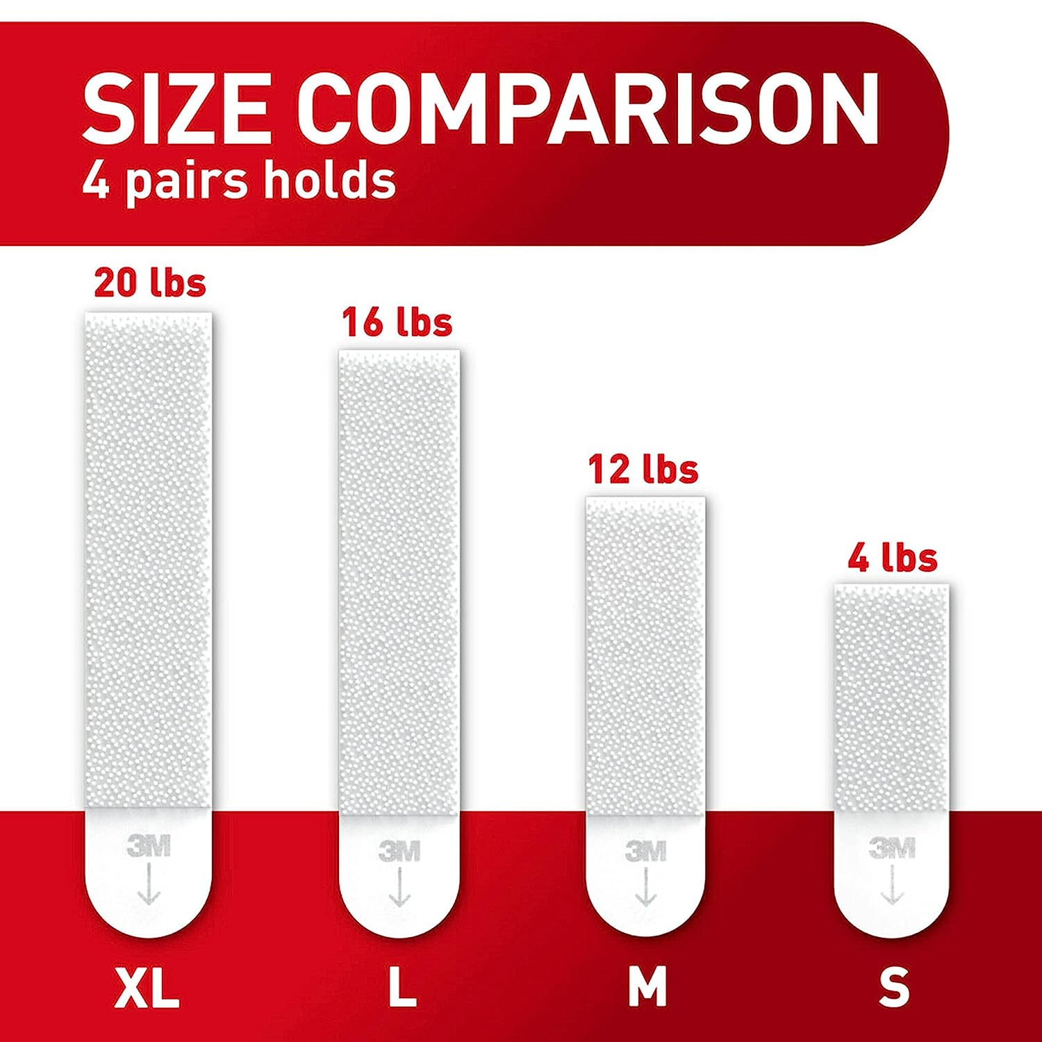 Command White Large Picture Hanging Strips let you decorate how you want, when you want, without damaging surfaces. A great home improvement item, these picture hangers stick on a variety of smooth surfaces without leaving holes, marks or sticky residue. Use these wall hanging strips to hang picture frames, college dorm decor, wooden letters, nursery decor, calendars or to create a gallery wall. Simply mount these picture strips on painted walls, finished wood, painted concrete cinder blocks, laminate, glass, metal and tiles and enjoy the damage free hanging of your favorite decorations. Perfect for home renovators and college students, use these Command Picture Hanging Strips in your home, office, apartment or dorm room to elevate the appearance of your living or working space without tools. Directions are included; follow the directions closely to use the 3M Wall Hanging Strips as intended. A clever decorating solution that doesn’t damage surfaces, these wall hanger strips will help you fearlessly change your space. One package contains 4 pairs of large white picture hanging strips. Four adhesive strip pairs hold up to 16 pounds with a maximum frame size of 24 x 36 inches. Decorate, organize and celebrate damage free with Command.