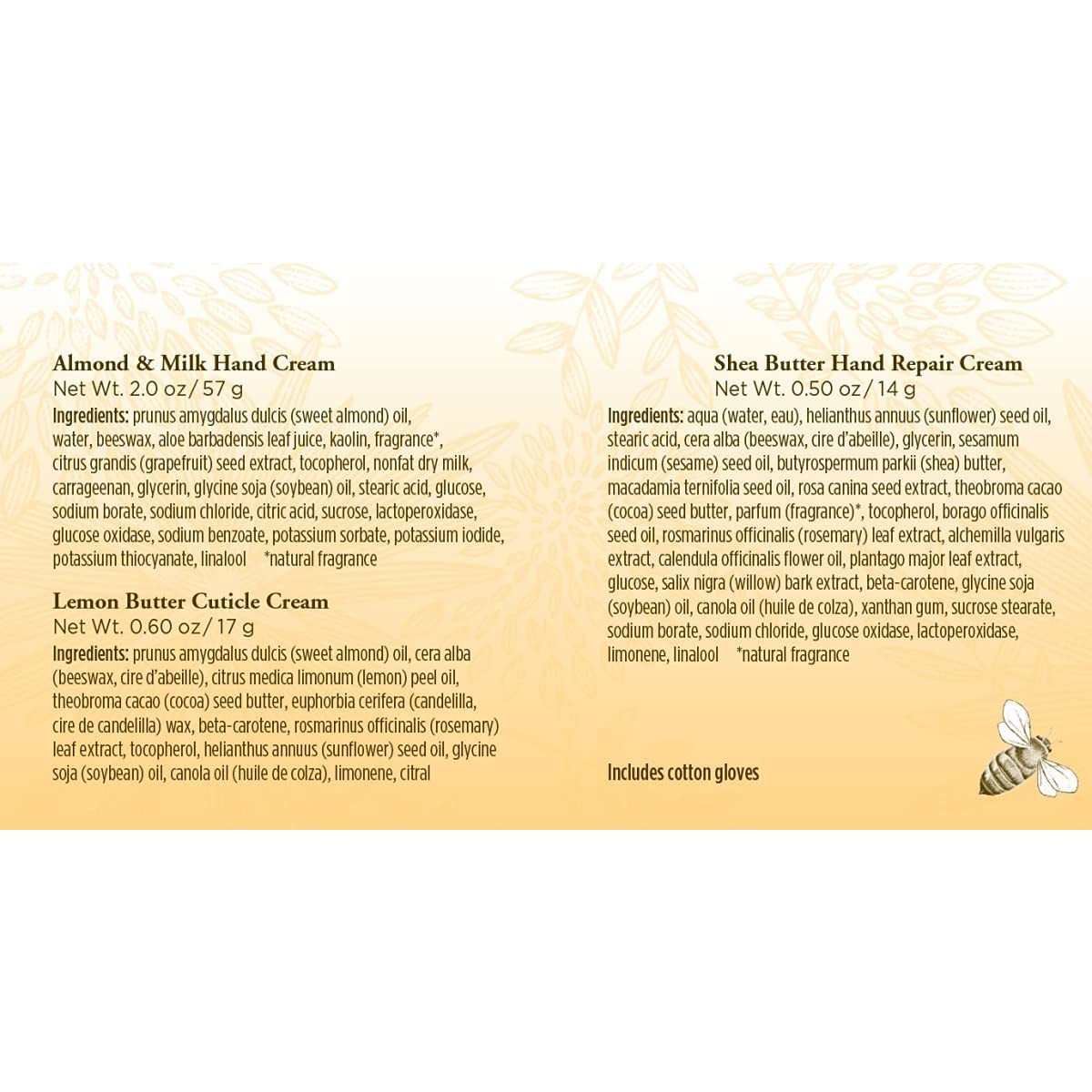 • SKIN CARE PRODUCTS: Pamper from head to toe with this giftable set including 5 travel size Burt's Bees favorites: Soap Bark and Chamomile Deep Cleansing Cream, Hand Salve, Milk & Honey Body Lotion, Coconut Foot Cream and Beeswax Lip Balm.