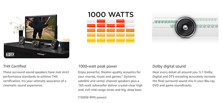 - 5.1 digital surround sound: Hear every detail in your Dolby Digital and DTS soundtracks the way the studio intended. Sub woofer: 165 Watts