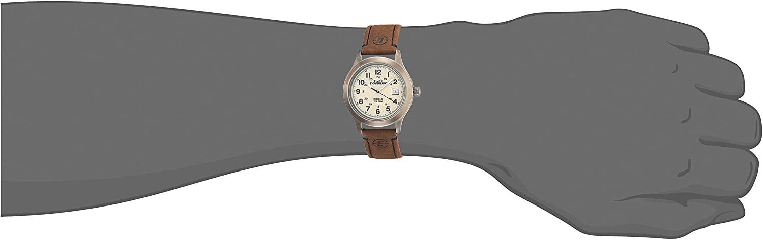 "While it looks like a casual watch, the full-sized Timex Men's T40051 Expedition Metal Field Brown Leather Strap Watch adds a stylish yet rugged complement to your everyday wear. It features a large, round silver-tone brass watch case with a flattened, brushed bezel that frames an olive green dial background with Arabic numerals, inset 24-hour notations, large, luminous stick hands (with seconds hand), and a date display at 3 o'clock. With the Quick Date function, you can set the date on the watch without turning the crown for every 24-hour period. Just pull the stem halfway out, and turn until desired date is reached. It also offers an 8-year battery life, water resistance to 165 feet (50 meters), and a durable genuine leather strap. The Indiglo night-light uniformly lights the surface of the watch dial using patented blue electroluminescent lighting technology. It uses less battery power than most other watch illumination systems, enabling your watch battery to last longer."