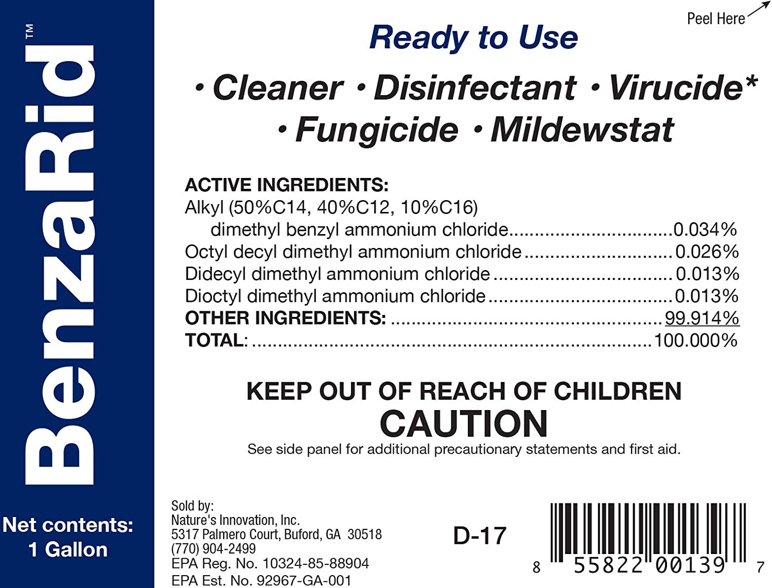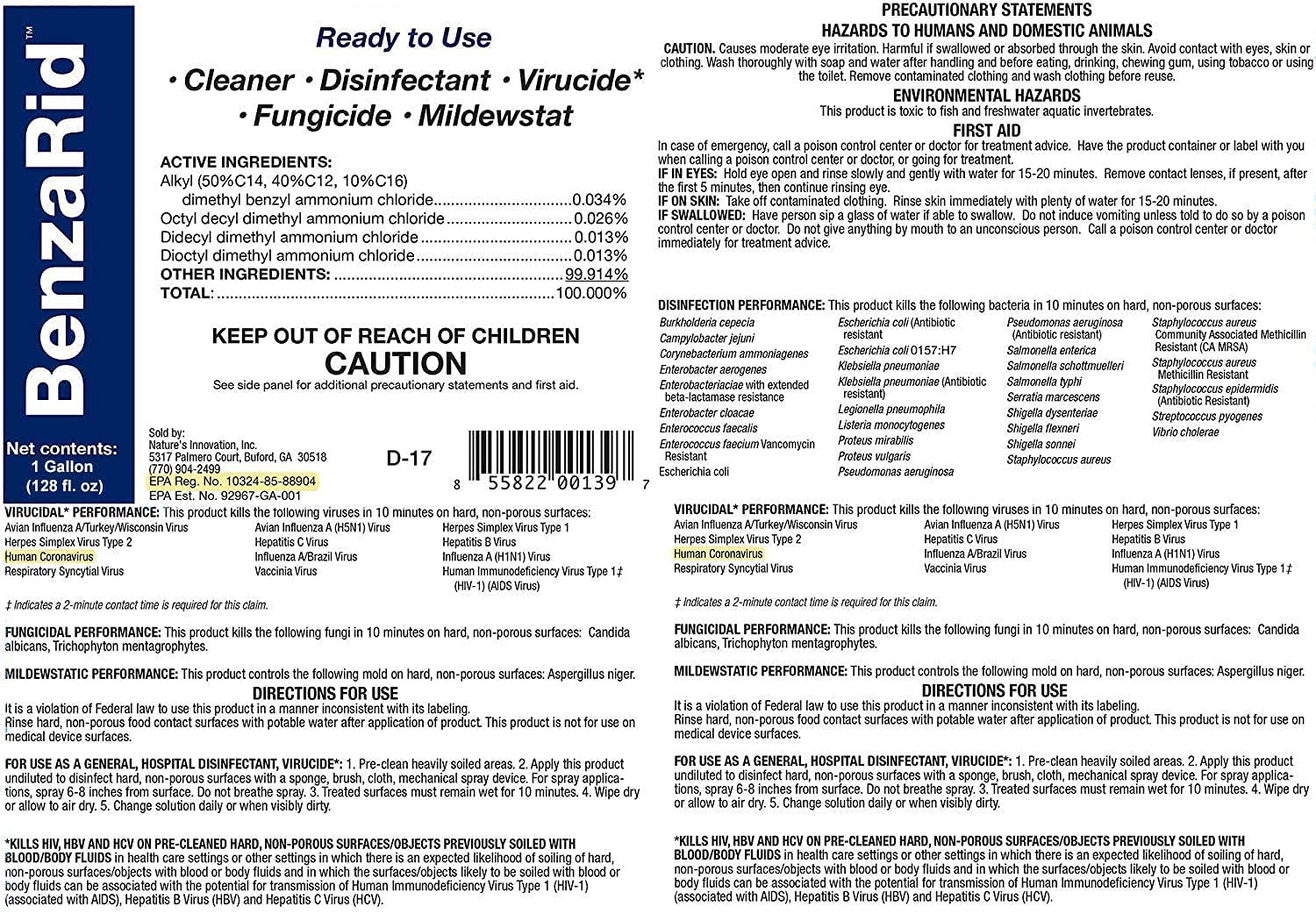 BenzaRid Hospital Grade Disinfectant (1 Gallon) | Professional Sanitizer & Virucide, Eradicates MRSA, H1N1, H5N1 Viruses, Avian Flu, Staph, Blood Borne Pathogens | Black Mold Remover