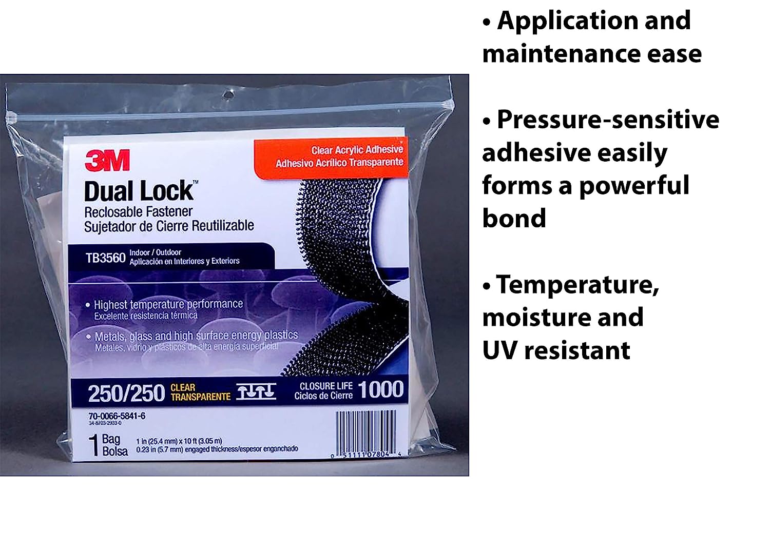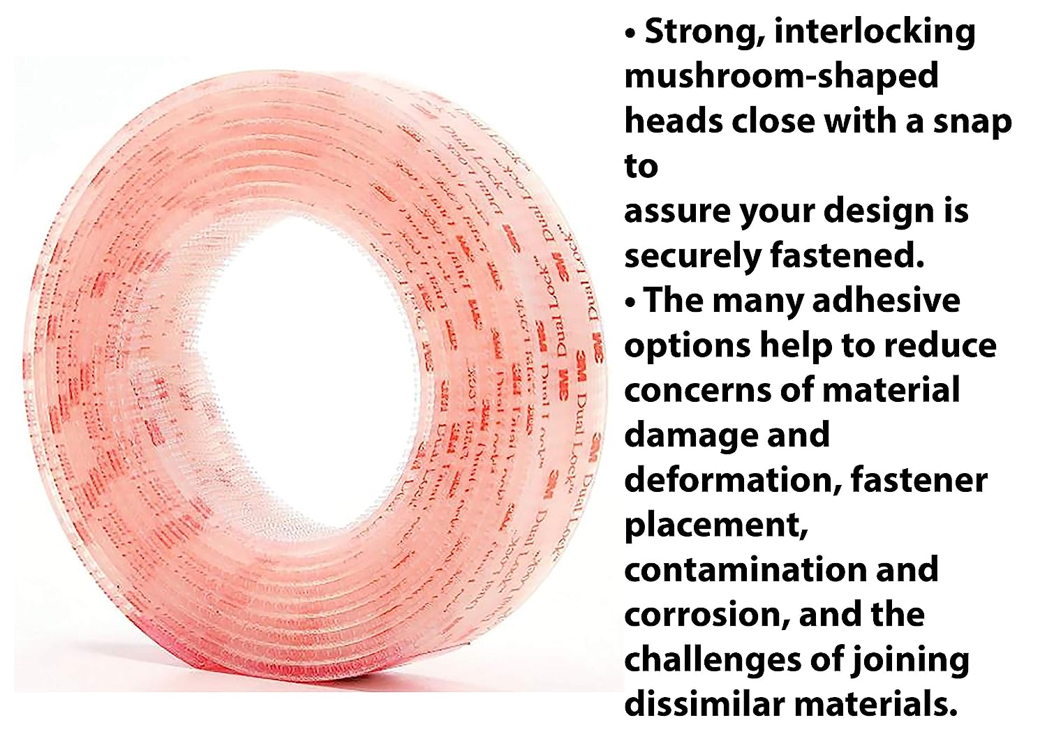 3M Dual Lock Reclosable Fasteners are used extensively in transportation, electronics, business equipment, machinery, medical, and sign and display markets They are ideal for both indoor and outdoor applications including, attaching signs, cushions, enclosure and access panels, banners, doors, adjustable shelving, vehicle ceiling panels, furniture seats and backs, and much more As a general rule, four square inches of fastener area per pound of static tensile or shear load to be supported (4in2 and lb) is suggested as a starting point for evaluation More or less area may be needed depending on specific conditions or end use applications Do not use too much of the reclosable fastener or it will be extremely challenging to separate the two parts Pry off with a screwdriver if necessary Customer is solely responsible for evaluating the product and determining whether it is appropriate and suitable for customer’s application