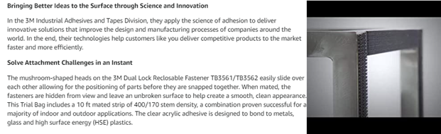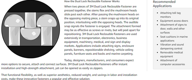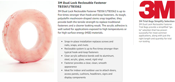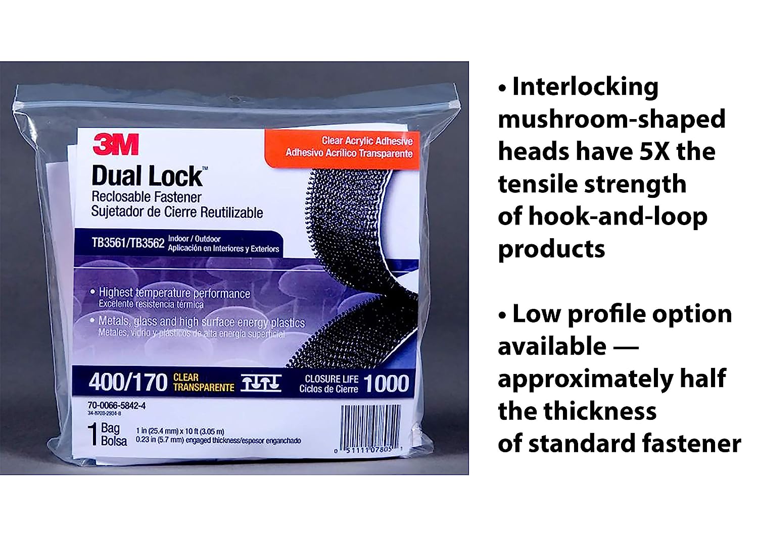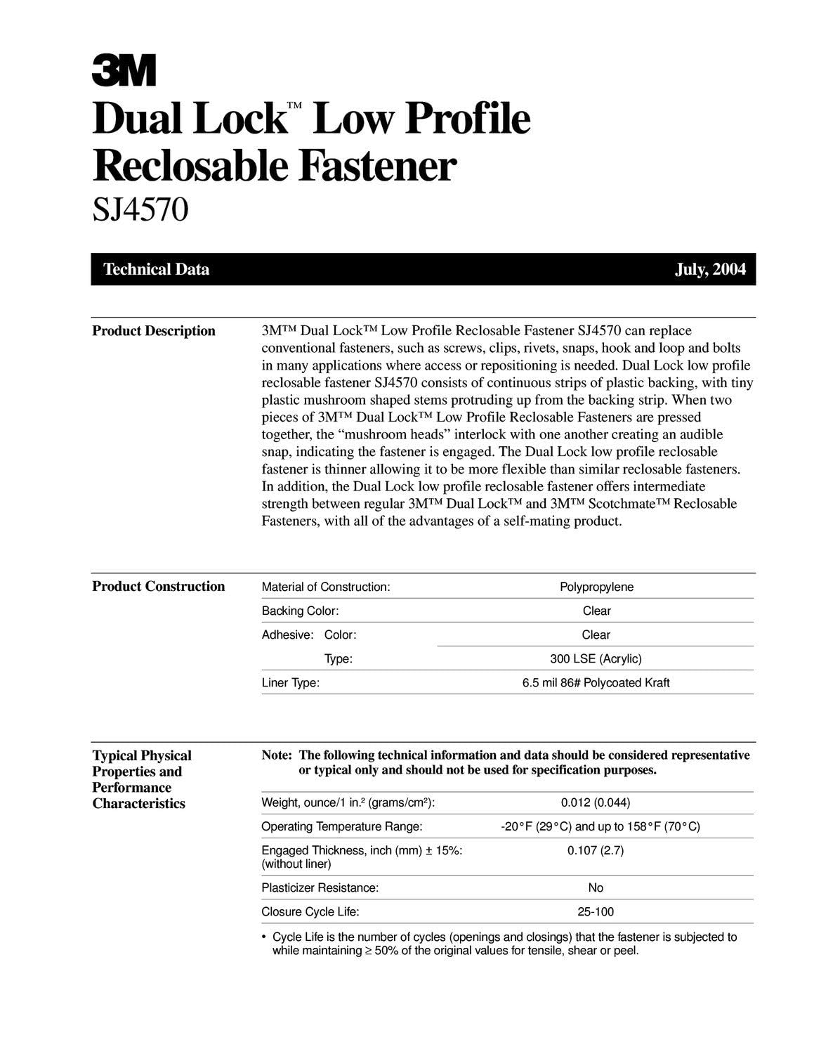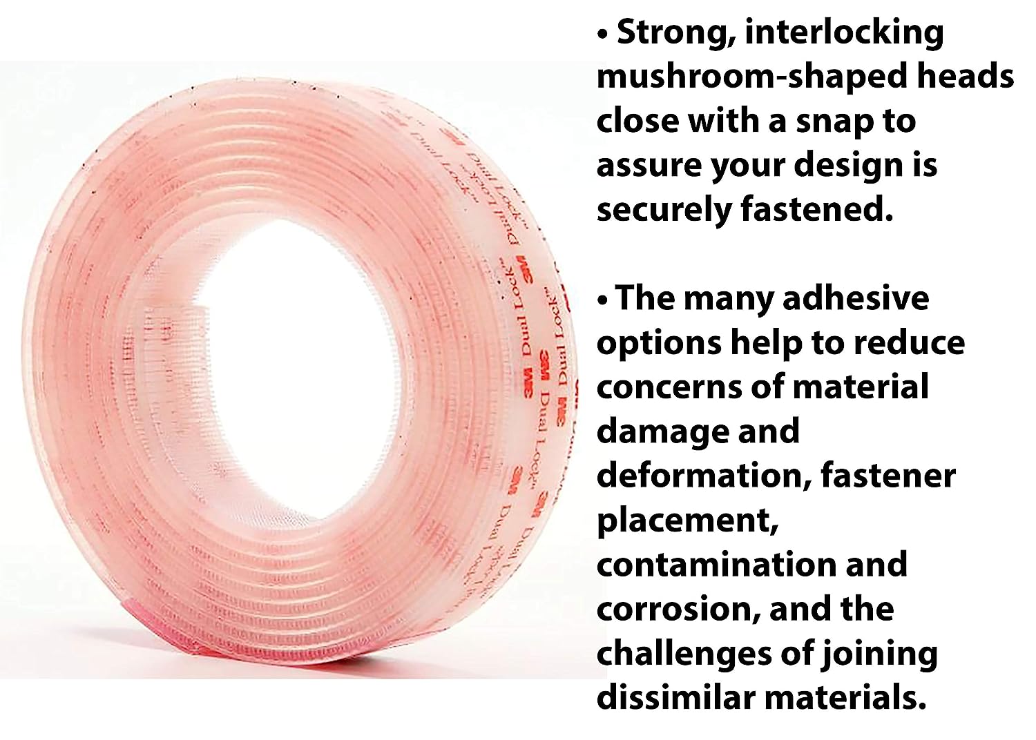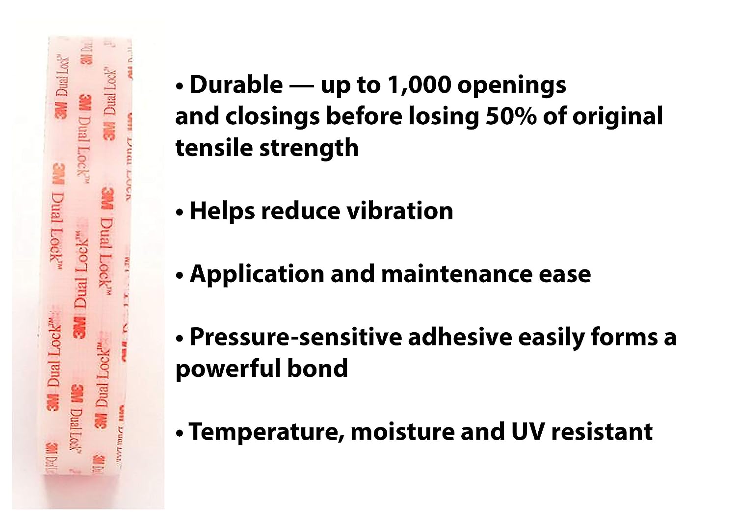 3M Dual Lock Reclosable Fasteners are used extensively in transportation, electronics, business equipment, machinery, medical, and sign and display markets They are ideal for both indoor and outdoor applications including, attaching signs, cushions, enclosure and access panels, banners, doors, adjustable shelving, vehicle ceiling panels, furniture seats and backs, and much more As a general rule, four square inches of fastener area per pound of static tensile or shear load to be supported (4in2 and lb) is suggested as a starting point for evaluation More or less area may be needed depending on specific conditions or end use applications Do not use too much of the reclosable fastener or it will be extremely challenging to separate the two parts Pry off with a screwdriver if necessary Customer is solely responsible for evaluating the product and determining whether it is appropriate and suitable for customer’s application