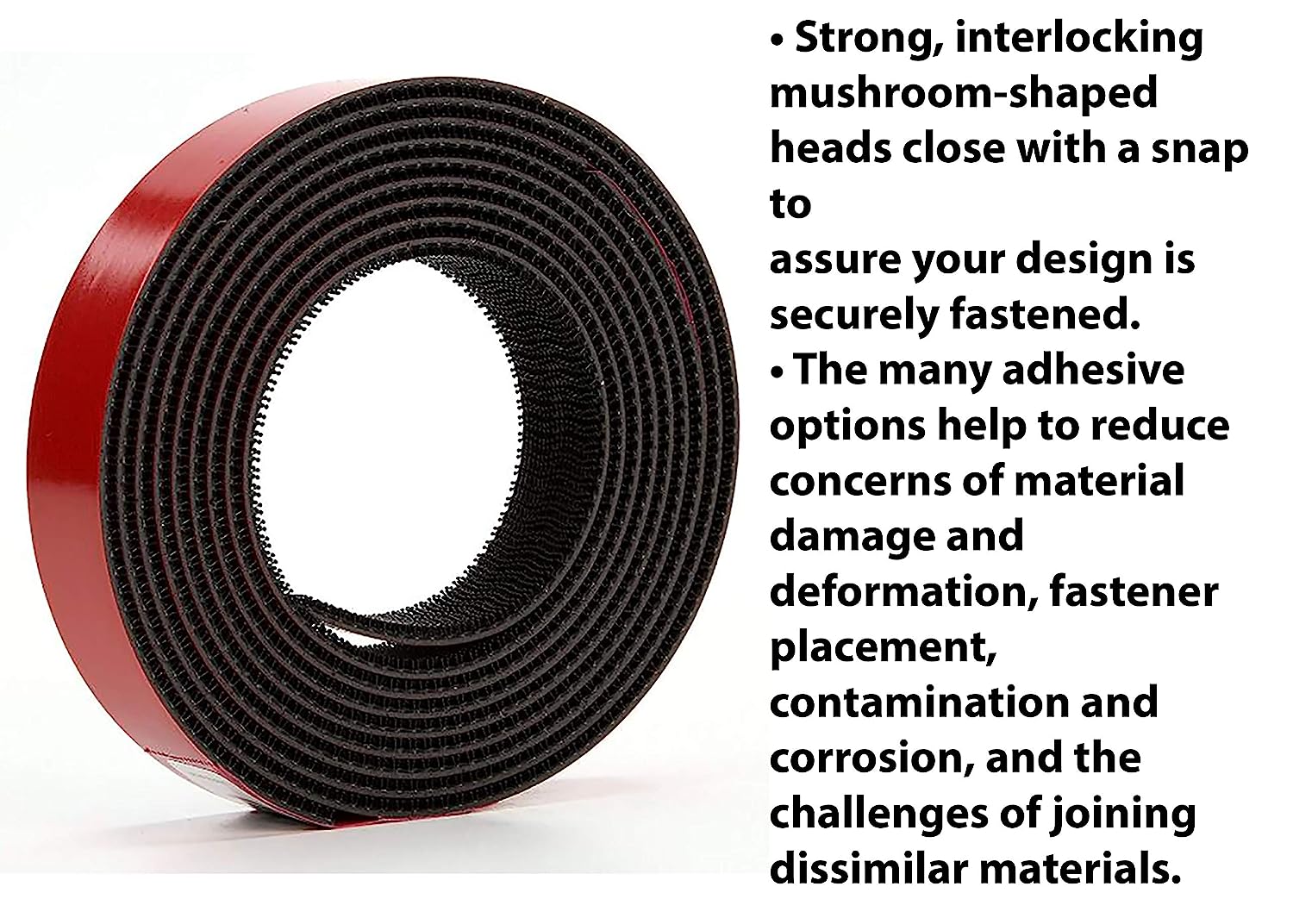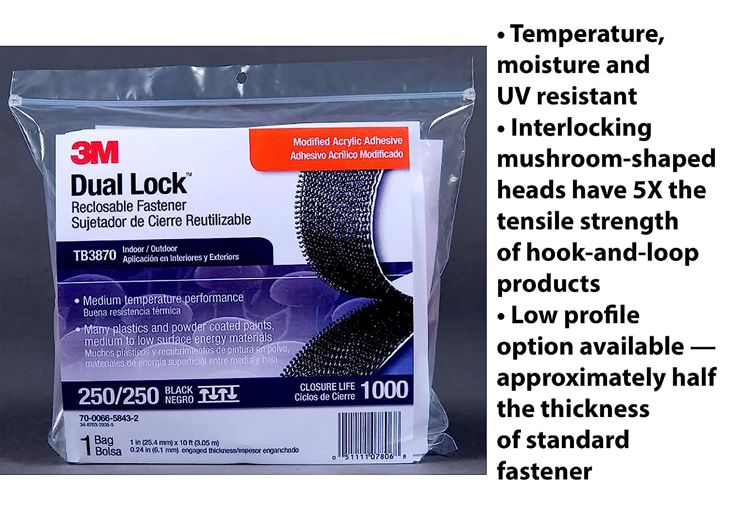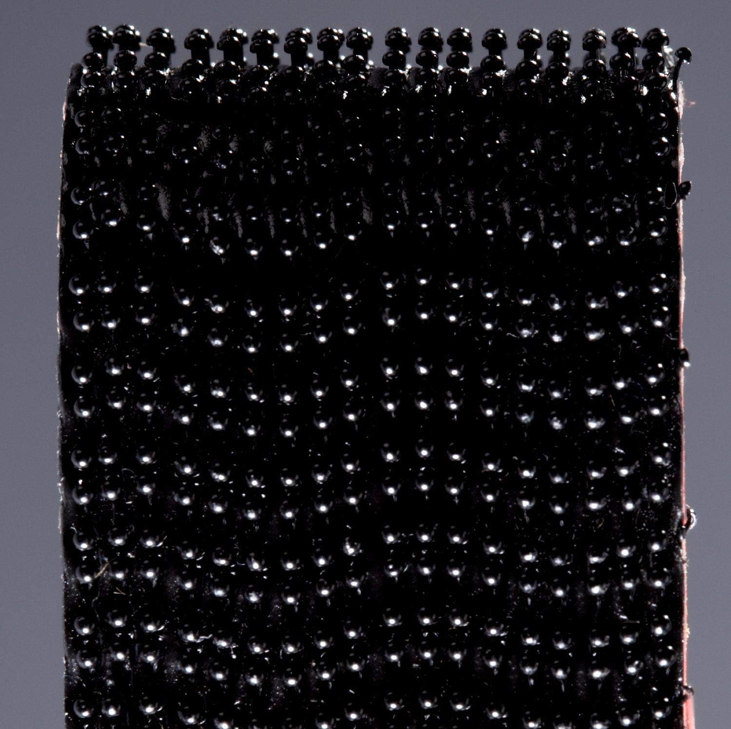 A modified acrylic adhesive on the back of a black polypropylene reclosable fastener. 250 stems per square inch. 0.24 inch engaged thickness. Closure life 1,000.