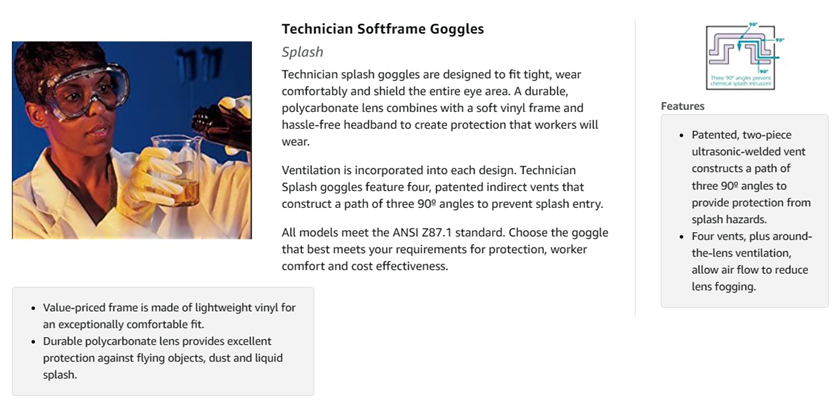 Gateway Safety A classic splash goggle line, Technician is a style that already has the confidence of many workers. Cap venting systems provide ideal impact protection for dusty environments. Unique 390 venting system, Patented 390 (three separate 90 degrees angles) ventilation system creates one of the best splash goggles available. Available in clear anti-fog lens. Underwriters Laboratories is the independent, third-party agency that has certified that this product meets the ANSI Z87+ and CSA Z94. 3 standards. Gateway Safety and an independent third party laboratory regularly test and certify that this product meets or exceeds the ANSI Z87. 1+ standard. Gateway Safety and an independent third party laboratory regularly test and certify that this product meets or exceeds the CSA Z94. 3 standard. Gateway Safety regularly tests and certifies that this product blocks 99. 9% of UV-A, UV-B and UV-C radiation up to 380nm. These untinted lenses are ideal for indoor and general purpose applications.