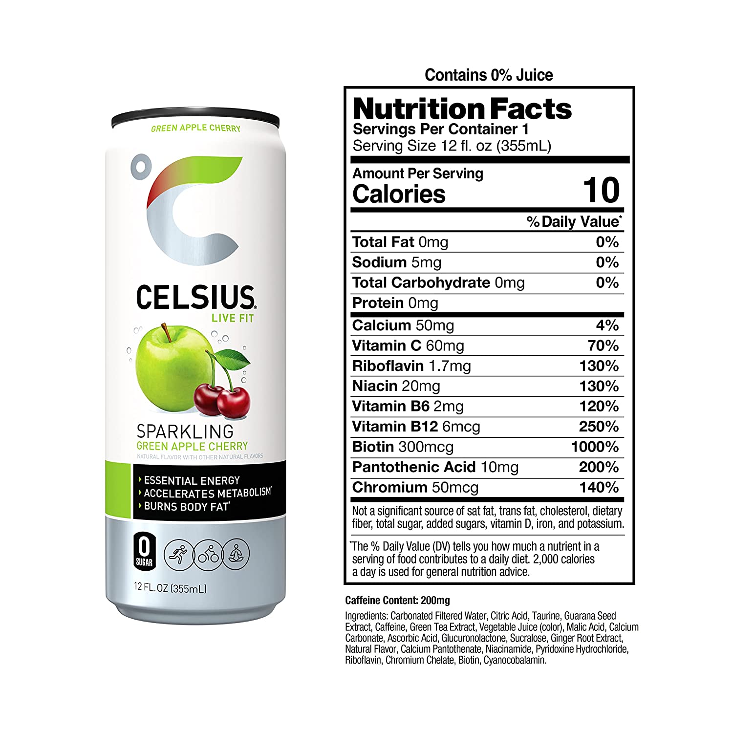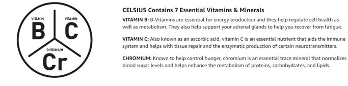 CELSIUS is packed with 7 essential vitamins, contains zero sugar, no artificial colors, no aspartame and no high fructose corn syrup.