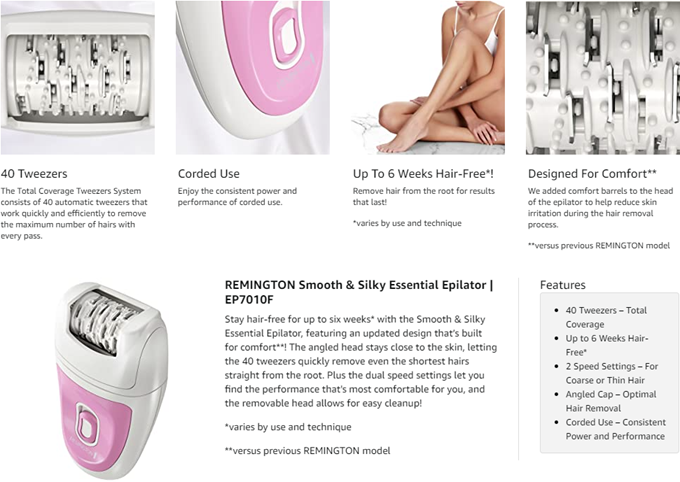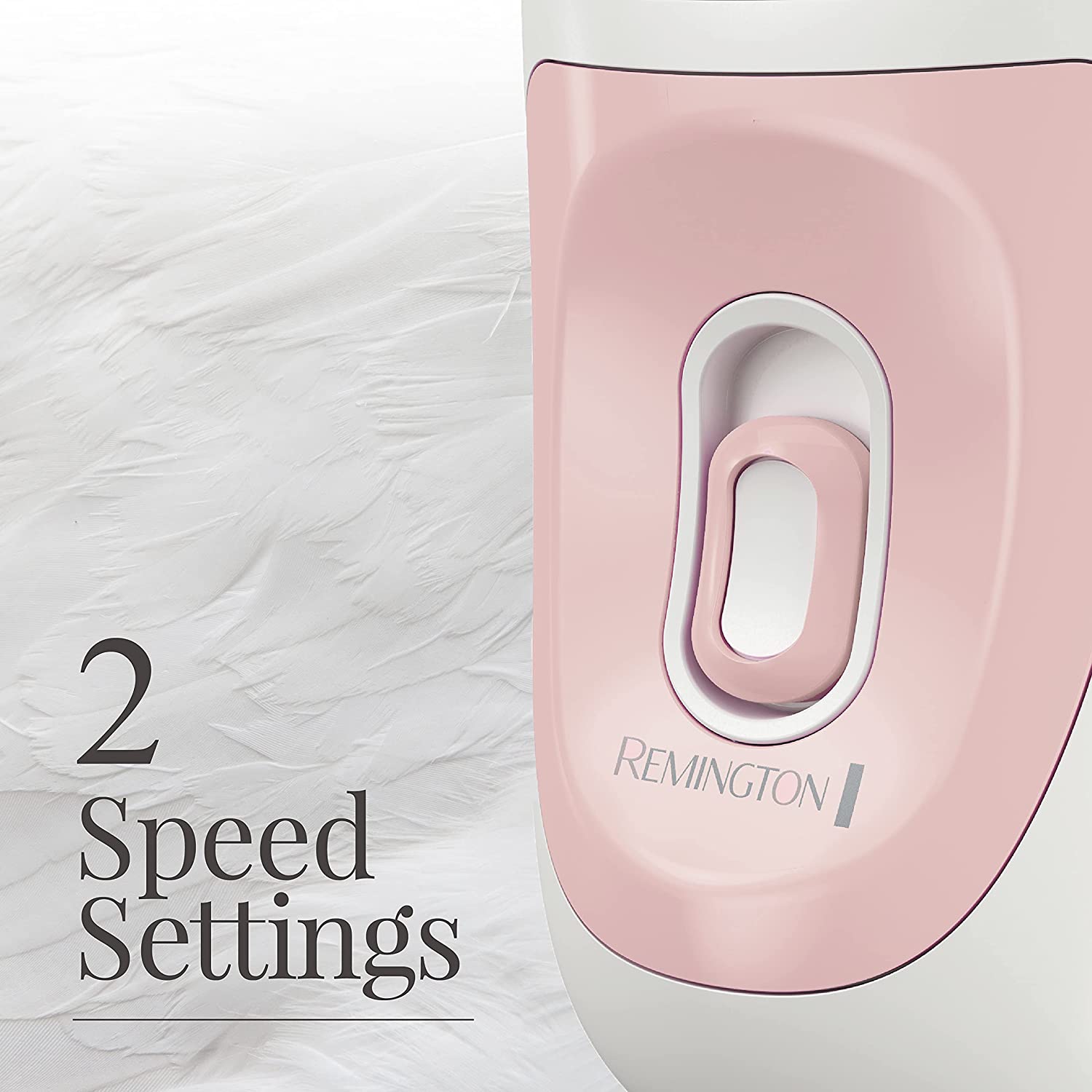 Stay hair-free for up to six weeks* with the Smooth & Silky Essential Epilator, featuring an updated design that’s built for comfort**! The angled head stays close to the skin, letting the 40 tweezers quickly remove even the shortest hairs straight from the root. Plus the dual speed settings let you find the performance that's most comfortable for you, and the removable head allows for easy cleanup! *varies by use and technique **versus previous REMINGTON model.