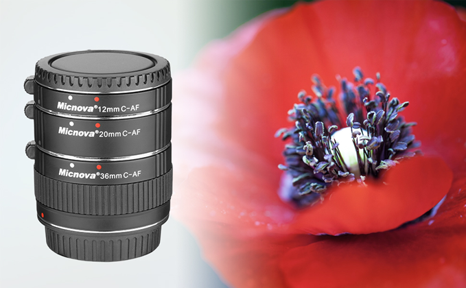 The KK-C68 Extension tubes are designed to enable a lens to focus closer than its normal set minimum focusing distance. Getting closer has the effect of magnifying your subject (making it appear larger in the viewfinder and in your pictures). They are exceptionally useful for macro photography, enabling you to convert almost any lens into a macro lens at a fraction of the cost while maintaining its original optical quality. This Autofocus Extension Tube Set (12/20/36mm) for Canon from Micnova contains three tubes of different length, a 12 mm, 20 mm and 36 mm, which can be used individually or in any combination to obtain the desired magnification. (An individual 25mm autofocus extension tube is available).