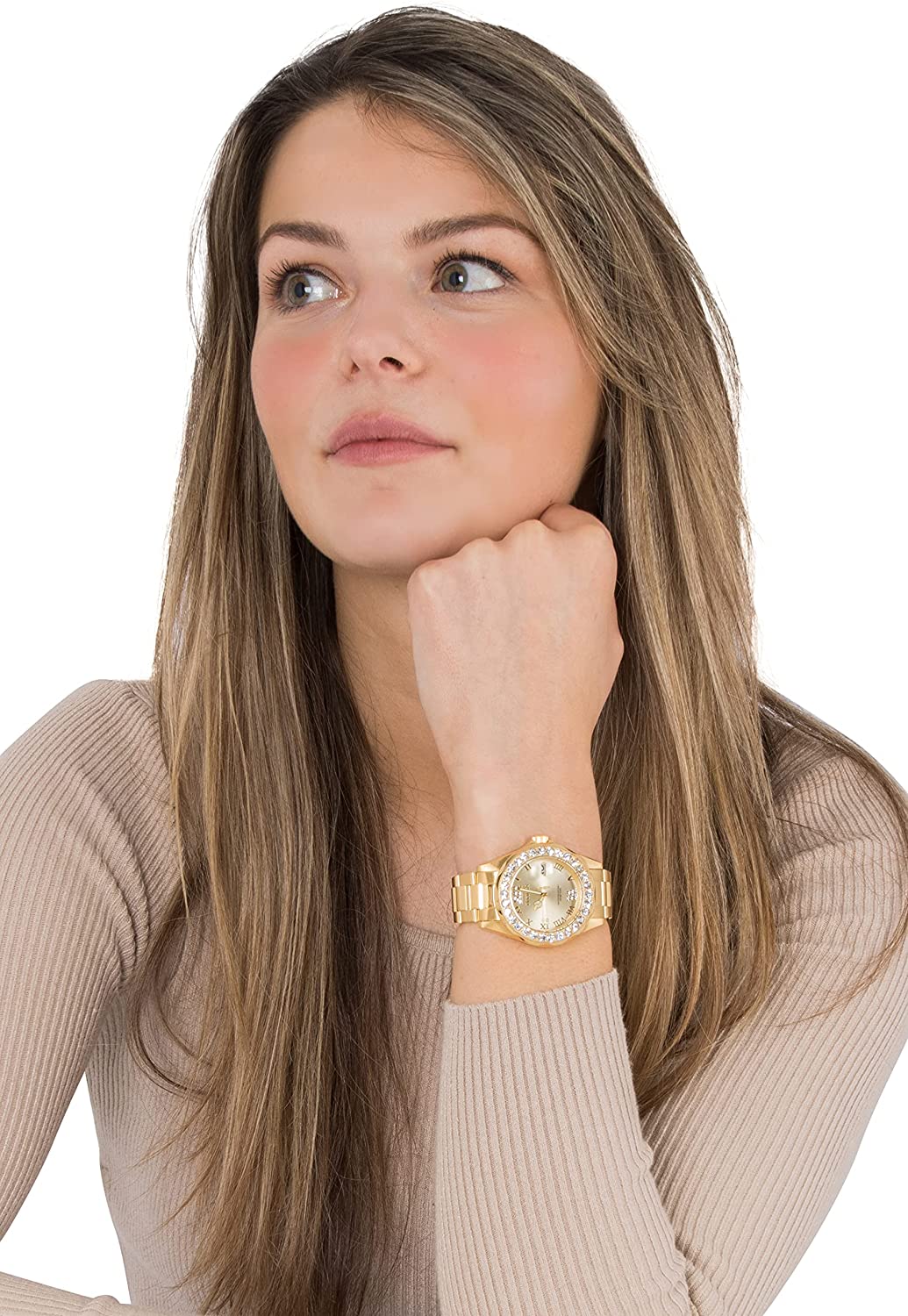 - Mineral crystal; Push/pull crown; Stationary gold tone stainless steel bezel accented with 30 crystals; 100 meter water resistant: Suitable for recreational surfing, swimming, snorkeling, sailing and water sports. Not suitable for diving.