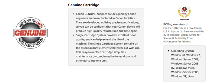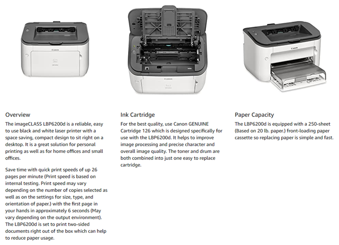 Canon imageCLASS Monochrome Laser Printer LBP6200D Monochrome Laser Printer. Space saving design will fit right on a desktop, reduce paper use with automatic two-sided printing right out of the box. Save time with print speeds of up to 26 pages per minute, first print in approx. 6 seconds. Efficient Energy Saver mode uses approximately 1.3 Watts, cutting energy usage and costs. The toner and drum are both combined into just one easy to replace Canon cartridge 126 to help improve image processing and precise character and overall image quality. Canon Drivers for Windows and Linux OS included, USB cable (sold separately)
