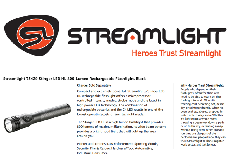 Streamlight 75429 Stinger LED HL Rechargeable High Lumen Flashlight without Charger. Streamlight's HL Series - now available in rechargeable systems. When you need maximum illumination with a wide beam to search a large area, the Stinger LED HL rechargeable, high lumen flashlight provides a blast of 640-lumen with 297-meter of beam distance. 3-Lighting modes and strobe: High for high-lumen and super-bright light; Medium for intense brightness and longer run time; Low for extended run times and when a less intense beam is ideal; Strobe for signaling or disorienting. C4 LED technology, shock-proof with a 50,000 hour lifetime. Deep-dish parabolic reflector produces a concentrated beam with optimum peripheral illumination. Optimized electronics provide regulated intensity throughout battery charge. NiMH battery rechargeable up to 1000 times; also accepts NiCd battery. Made up of 6000 series machined aircraft aluminum with non-slip rubberized comfort grip and anti-roll rubber ring. Unbreakable polycarbonate lens with scratch-resistant coating. IPX4 water resistant and 1-meter impact resistance tested. Serialized for positive identification. Length: 8.41-inch (21.36 cm) and weight: 12.4-ounce (352 g). Comes with a limited lifetime warranty.