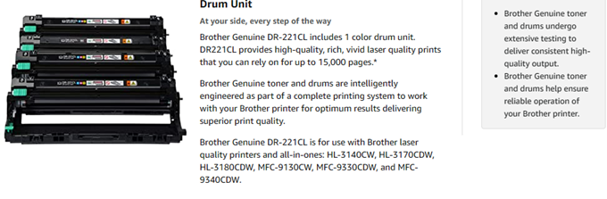 Business professionals who have invested money in high-quality Brother products expect the same from replacement supplies. The Brother Genuine DR-221CL Color Drum Unit is a replacement drum for use with 6 different Brother printers and all-in-ones, intelligently engineered as part of a complete printing system. These genuine replacement Drum Units are produced with precision to deliver vibrant, sharp text and graphics with every page printed. The DR-221CL drum unit yields approximately 15,000 pages(1) when used with Brother Genuine toner cartridges (sold separately).