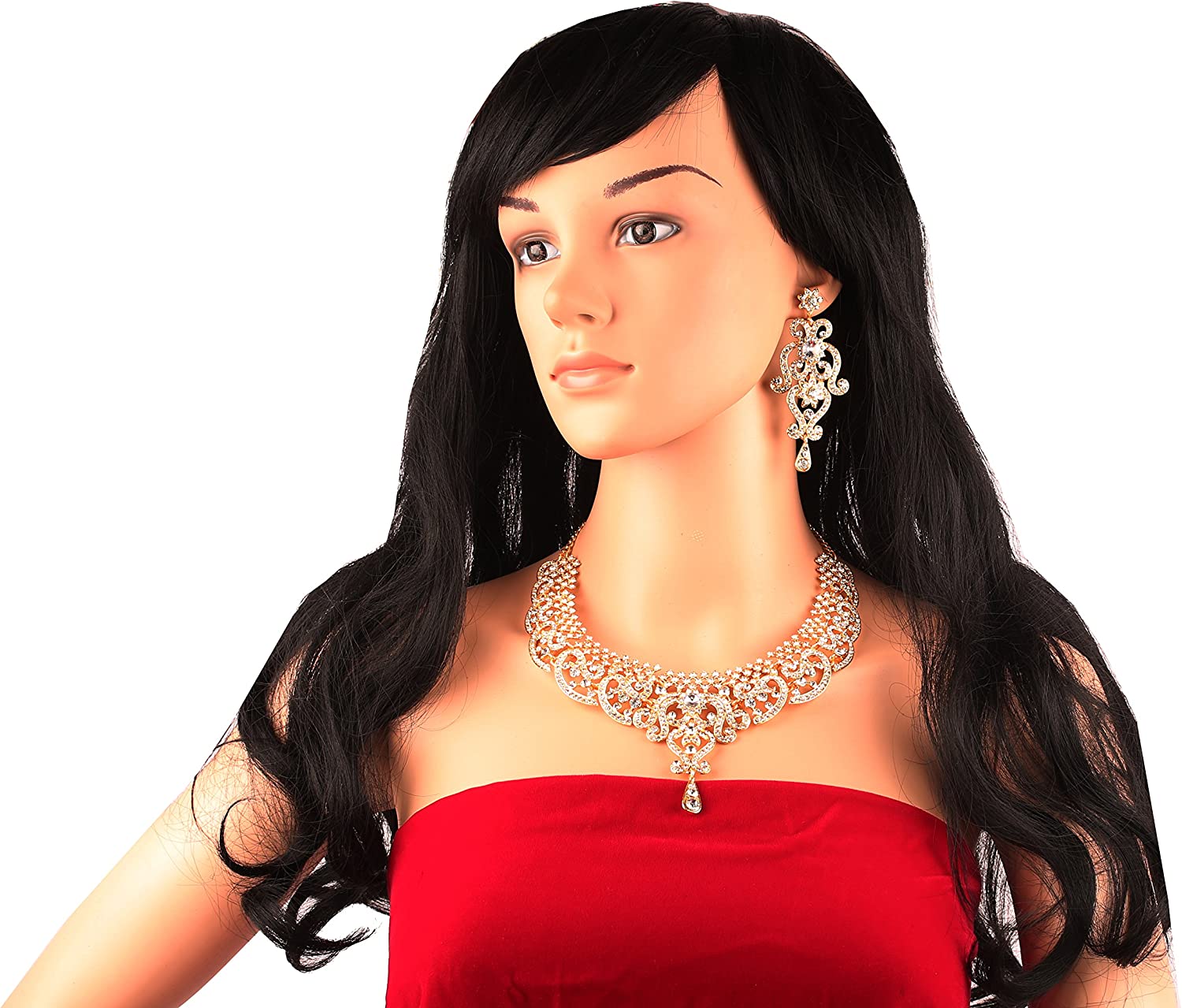 - Touchstone Indian Bollywood Choice Rich Traditional Exclusive Floral Workmanship Sparkling Rhinestone Designer Jewelry Grand ModernBridal Necklace Set With Mangtiak In Gold Tone For Women. EXTRA LONG EARRINGS. Length 3 inches SPECIFICATIONS : V shape necklace. Necklace circumference 18 inches. Earring weight (single) 18 gms. Earring length 3 inches . Earring width 1.25 inch.
