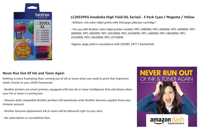 The use of Brother Genuine replacement high yield ink cartridges like the LC2033PKS not only produces rich, vibrant, color pages with the quality you expect from Brother products –they also increase productivity and can reduce downtime when fulfilled through Amazon Dash Replenishment. The Brother LC2033PKS replacement ink cartridge is compatible with 12 Brother Inkjet printers. These professional ink cartridges are intelligently engineered to work in seamless unison with your Brother printer. This product is sold as a three-pack of individual color ink cartridges.
