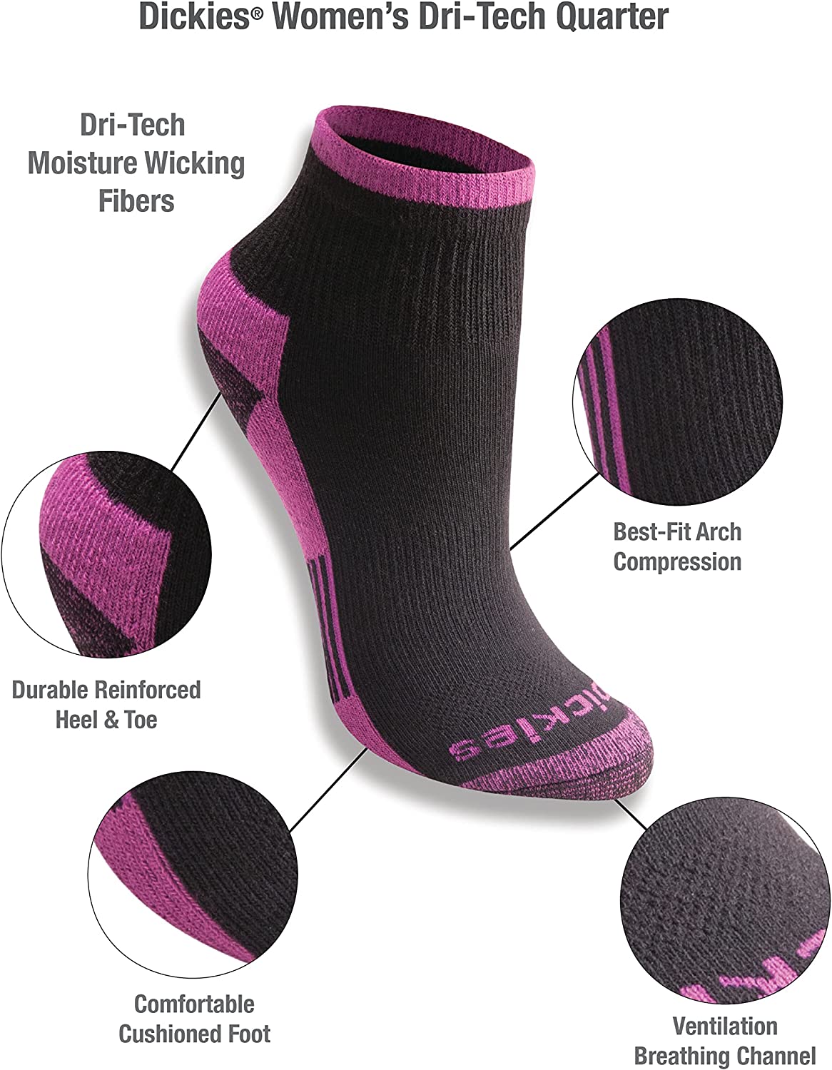 Dickies dri-tech moisture control for women 6-pack quarter sock combines moisture wicking fibers and mesh ventilation channels to keep feet dry and comfortable.