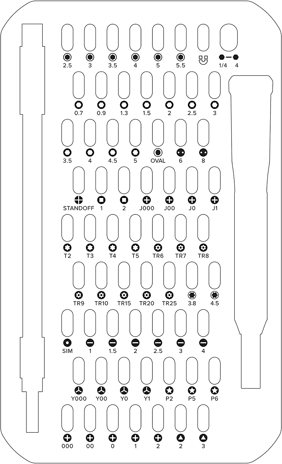 | Head Style | Phillips, Flathead, Torx, Torx Security, Pentalobe, JIS, Hex, Tri-point, Nut Driver, Square, Gamebit, Spanner, Triangle, SIM Eject, Oval, Magnetic Pickup, Standoff, |