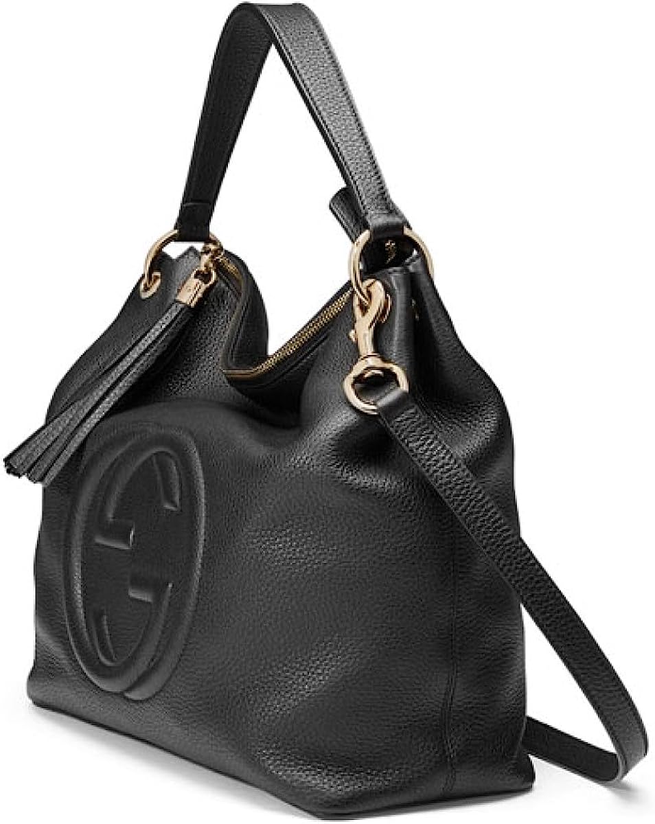 This black Gucci bag exudes luxury with its beautiful leather and gold-toned hardware. The famous interlocking GG logo is displayed proudly on the front. With a zipper pocket and two open pockets befitting of a phone, you'll have space to organize what you need to bring with you.