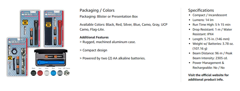 | Included Components | Maglite Mini Incandescent 2-Cell AA Flashlight Combo, Black |