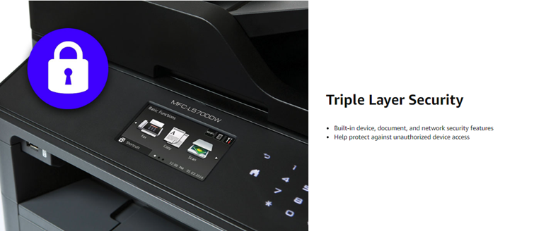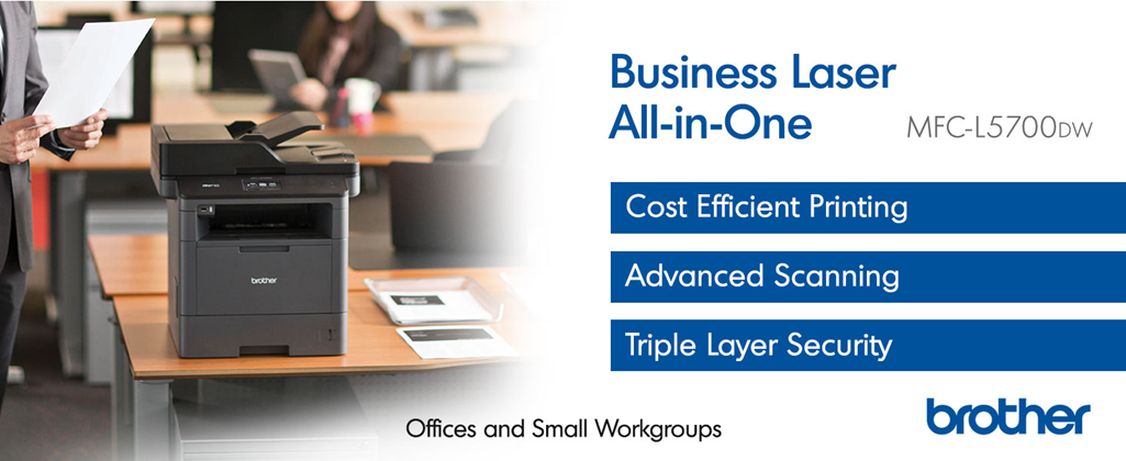 Brother All-in-One Laser Printer MFC-L5700DW was engineered to help enhance your workflow’s productivity with a print and copy speed of up to 42 pages per minute. (2) This high-performance all-in-one produces professional spreadsheets, reports, correspondence, and other important business documents with crisp graphics and text. Plus, this small office printer, copier, scanner, and fax machine offers simultaneous operation (for example, printing and scanning at the same time) so that multiple workgroup members can use the machine at once without experiencing slow-downs. A 3. 7” touchscreen makes menu navigation easy and permits you to create up to 48 customized shortcuts. The MFC-L5700DW offers flexible connectivity through a built-in wireless 802. 11b/g/n and Ethernet interface that allows multiple users to safely and securely submit tasks. Plus, scan to popular business cloud services directly from the touchscreen, including Evernote, Dropbox, Google Drive, OneNote, and more. (3) Users can also connect to the Brother Laser All-in-One through their mobile devices via popular mobile apps such as Brother’s free iPrint&Scan app, Cortado Workplace, AirPrint, and Wi-Fi Direct. (1, 3) For those with USB flash memory drives, printing is simple thanks to a built-in USB host located on the front of the machine. This business all-in-one is great for small to medium businesses that require flexible paper handling. The adjustable 250-sheet capacity paper tray and 50-sheet multipurpose tray make printing and copying simple. Users can upgrade all the way to 1, 340-sheet total capacity with optional trays (LT-5500, LT-6500). The Business Laser All-in-One is also very secure, utilizing Active Directory, Secure Function Lock, SSL Security, and more. Brother offers a 1-year limited and phone support for the lifes of your product. The MFC-L5700DW is also Dash Replenishment enabled. This system allows the printer to measure the toner level of your Genuine Brother Replacement Cartridges and automatically order replacements. This ensures you never run out of toner so that you can maintain the office efficiency you expect and require. (1)Requires connection to a wireless network. (2)Based on one-sided printing. Change from default setting required. (3)Requires an Internet connection and an account with desired service. (4)Approximate toner cartridge yield in accordance with ISO/IEC 19752 (letter/A4).