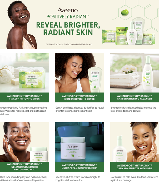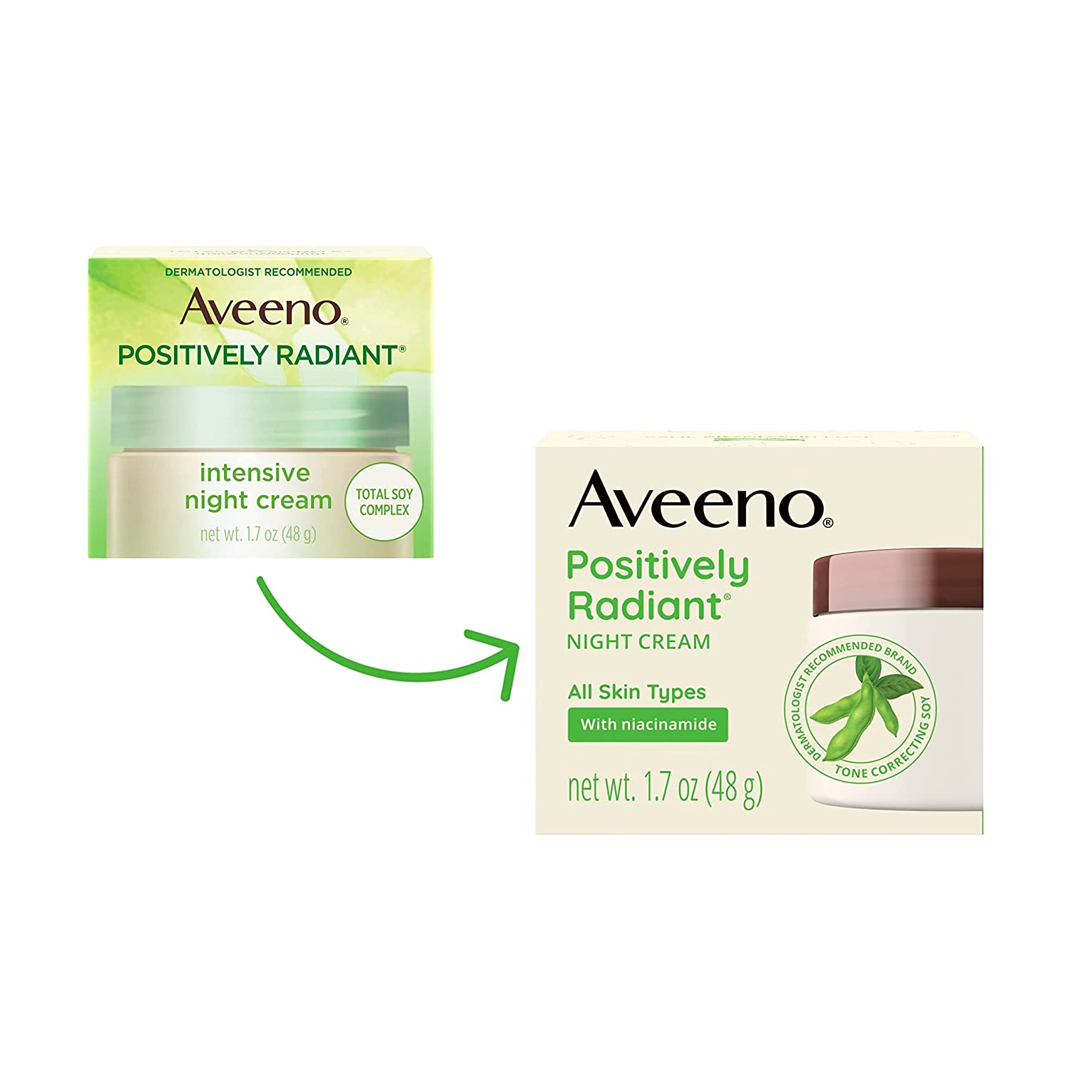 • Aveeno Positively Radiant Night Cream with soy gently improves skin tone and texture, helps reveal brighter, more radiant looking skin. Use in your nightly skincare routine to reduce the look of dark spots and reveal healthy-looking skin