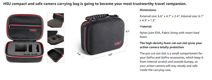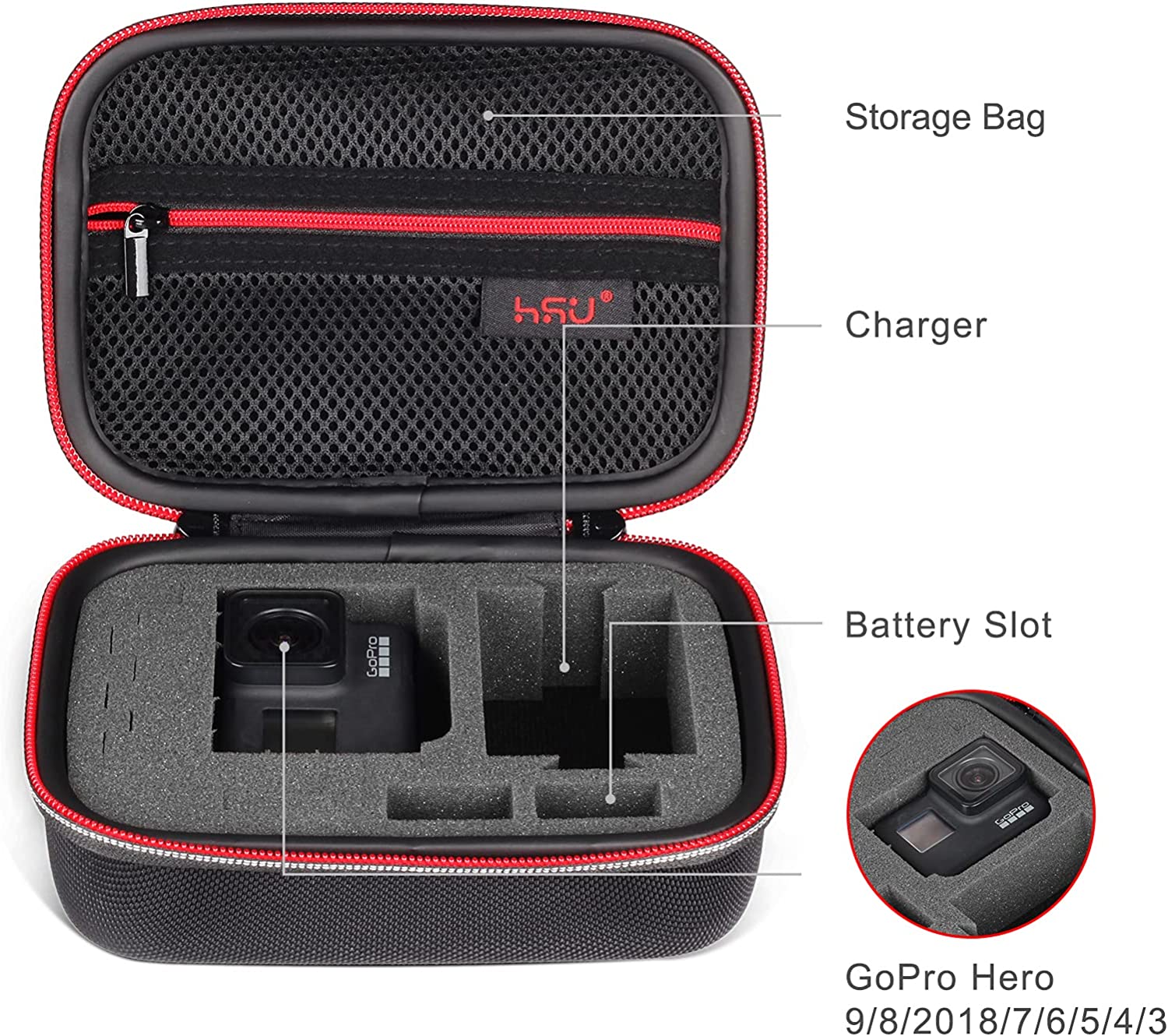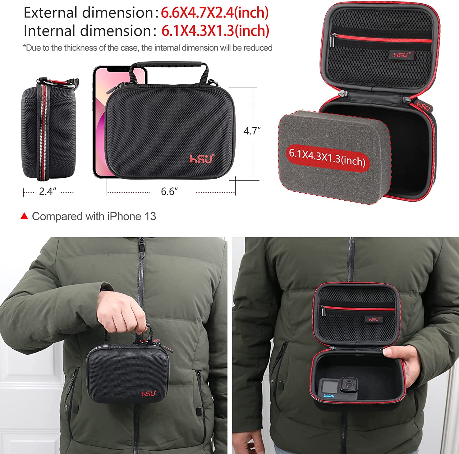• Small Carrying Case by HSU is a Protective Case specially designed for GoPro Hero 10/9/8 Black,7 Black, 6,5, 4, 3+, 3, 2, 1,Hero(2018), AKASO Brave 7/6/4 EK7000 V50 V50X Campark Dragon Touch REMALI 4K and other action cameras