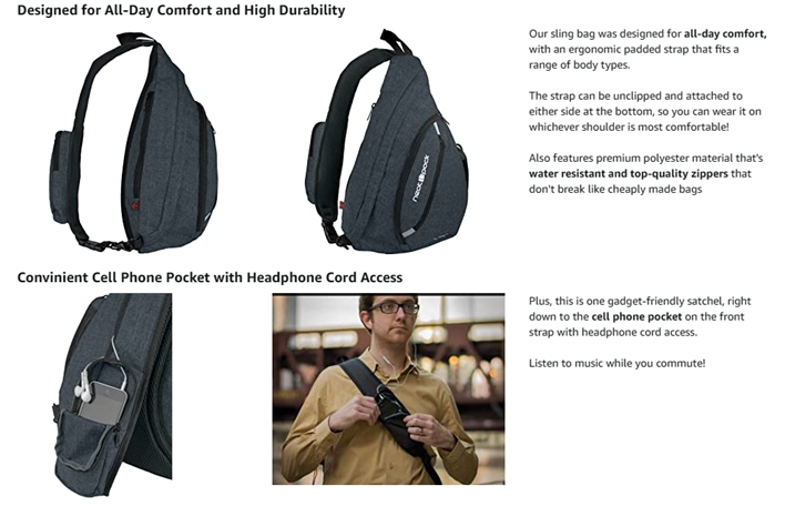 Wear a Number of Ways: Wear this sling bag over either shoulder comfortably, or in the front across the chest to deter thieves. Includes convenient front cell phone pocket with headphone access.