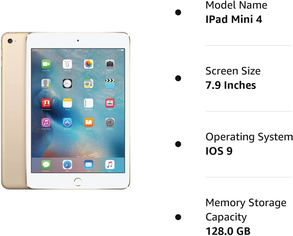The Apple iPad mini 4 is a useful device driven by a robust 1.5 GHz processor and running on iOS platform. The tablet is equipped with 128 GB memory storage. It also features a convenient 7.9-inch display that provides clear visuals. This Apple tablet supports Wi-Fi connectivity and lets its users wirelessly surf the Web, check e-mails, or stream videos. Furthermore, the Apple device has a built-in camera. Its weight is 0.67 lbs. The product is available in gold.