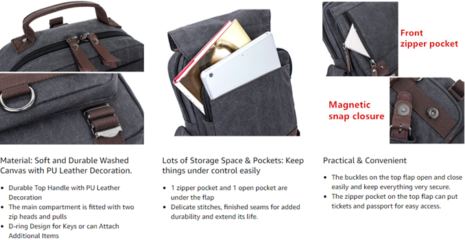 The buckles on the top flap open and close easily and keep everything very secure. The zipper pocket on the top flap can put tickets and passport for easy access. The strap is adjustable and ultra-comfortable across your back and chest. It can act as a single-shoulder bag/sling bag, or a cross-body bag for use.