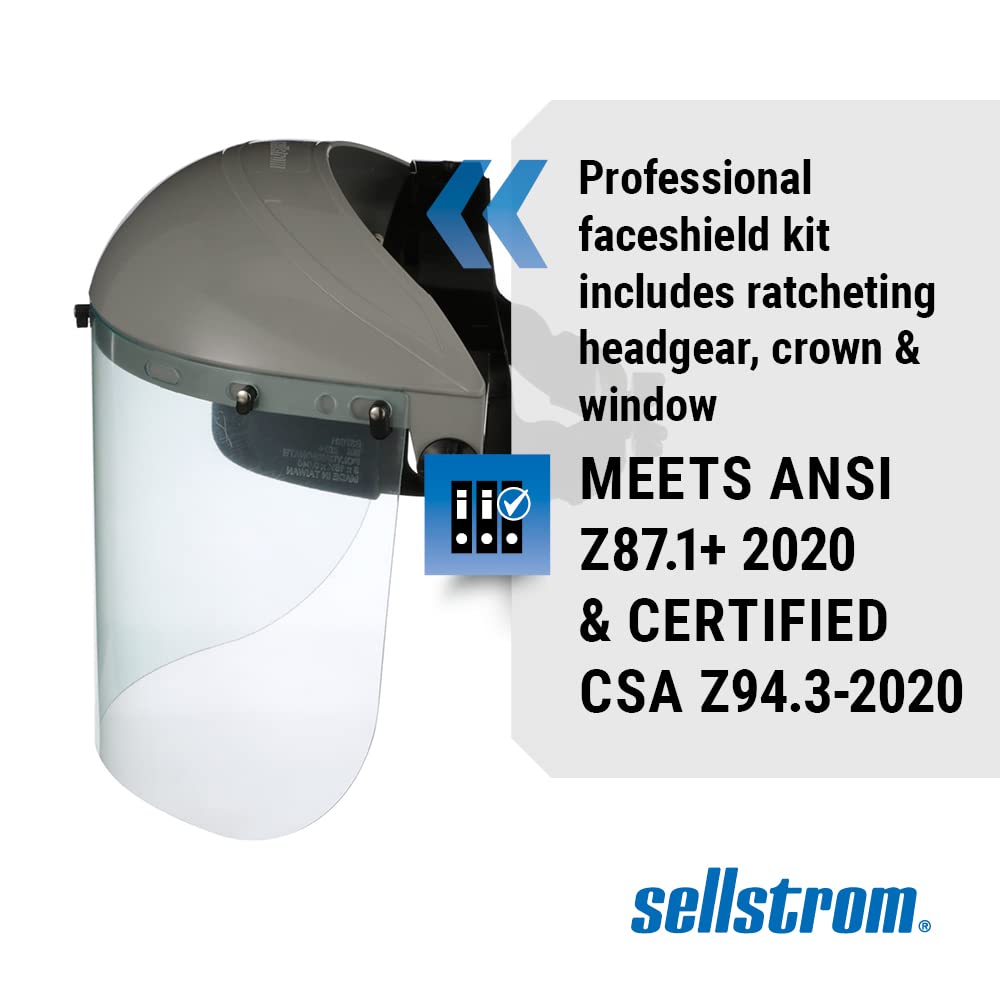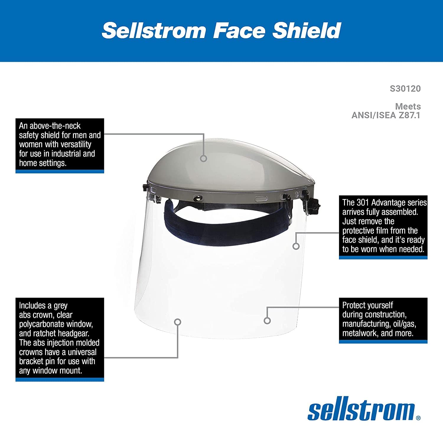 FACE SHIELD FEATURES: Includes a grey abs crown, uncoated clear polycarbonate window and ratchet headgear and pin closure. Abs injection molded crowns have universal bracket pin pattern for use with any window mount