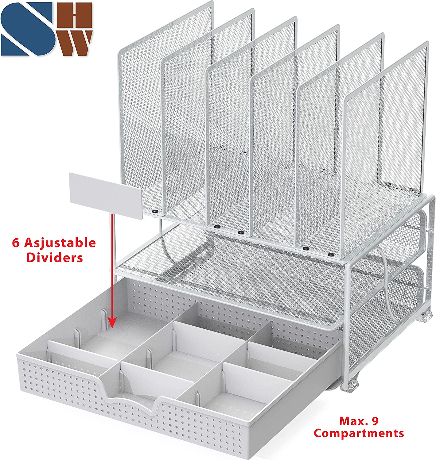 SimpleHouseware Mesh Desk Organizer with Sliding Drawer, Double Tray and 5 Upright Sections, Black