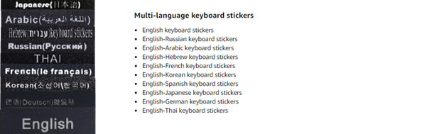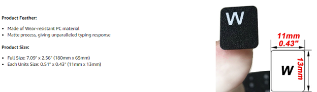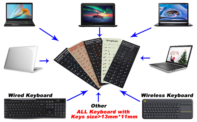 This keyboard stickers is specifically designed for different types of keyboard, such as: desktop wired keyboard, desktop wireless keyboard, laptop keyboard, notebook keyboard ...etc all kinds of keyboard(Just make sure keys size large than the sticker size: width 11mm x height 13mm)