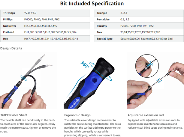 【Quality First】This pc tool kit drill bits are all made of CRV steel, 850℃ quenching process, hardness up to 60HRC, anti-wear, anti-oxidation, durable. The 4.56in five-section telescopic alloy steel extension rod is not easy to bend and deform, and is suitable for narrow gap holes. The 5.11in flexible shaft adopts inner double-layer spring, which has high elasticity and toughness, can be bent 180° and rotate 360°, and can dismantled with screws of various complicated angles.