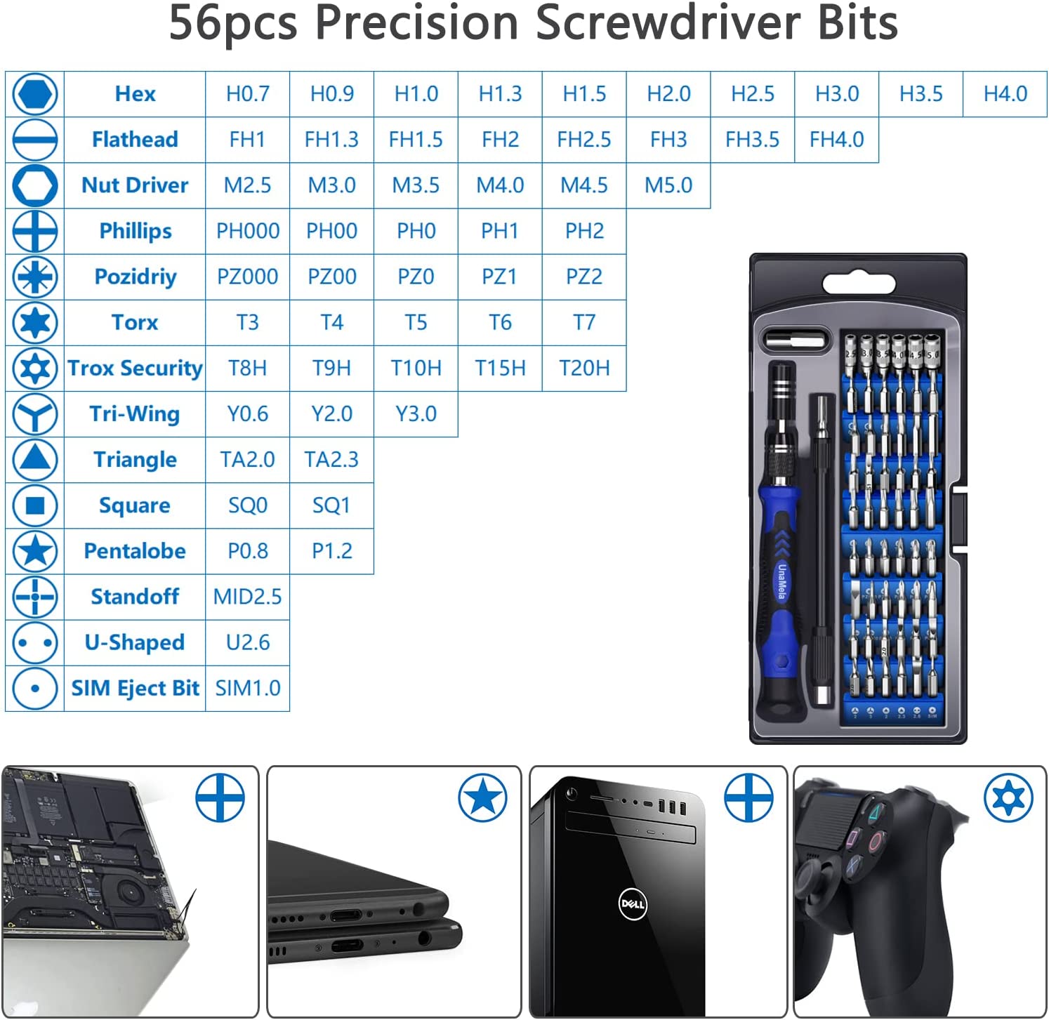 【Multiple Repair Functions】This precision screwdriver set includes complete bits for repairing electronic devices, 14 types, 56 bits (Phillips, Flat, Trox, Tri-Wing, Pentalobe, etc.). Use this tool to repair your computer, laptop, Camera, iPhone, Nintendo/Xbox/PS4 controller, SSD, air conditioner, TV, and so on. So you don't have to worry about damaged electronics at home.