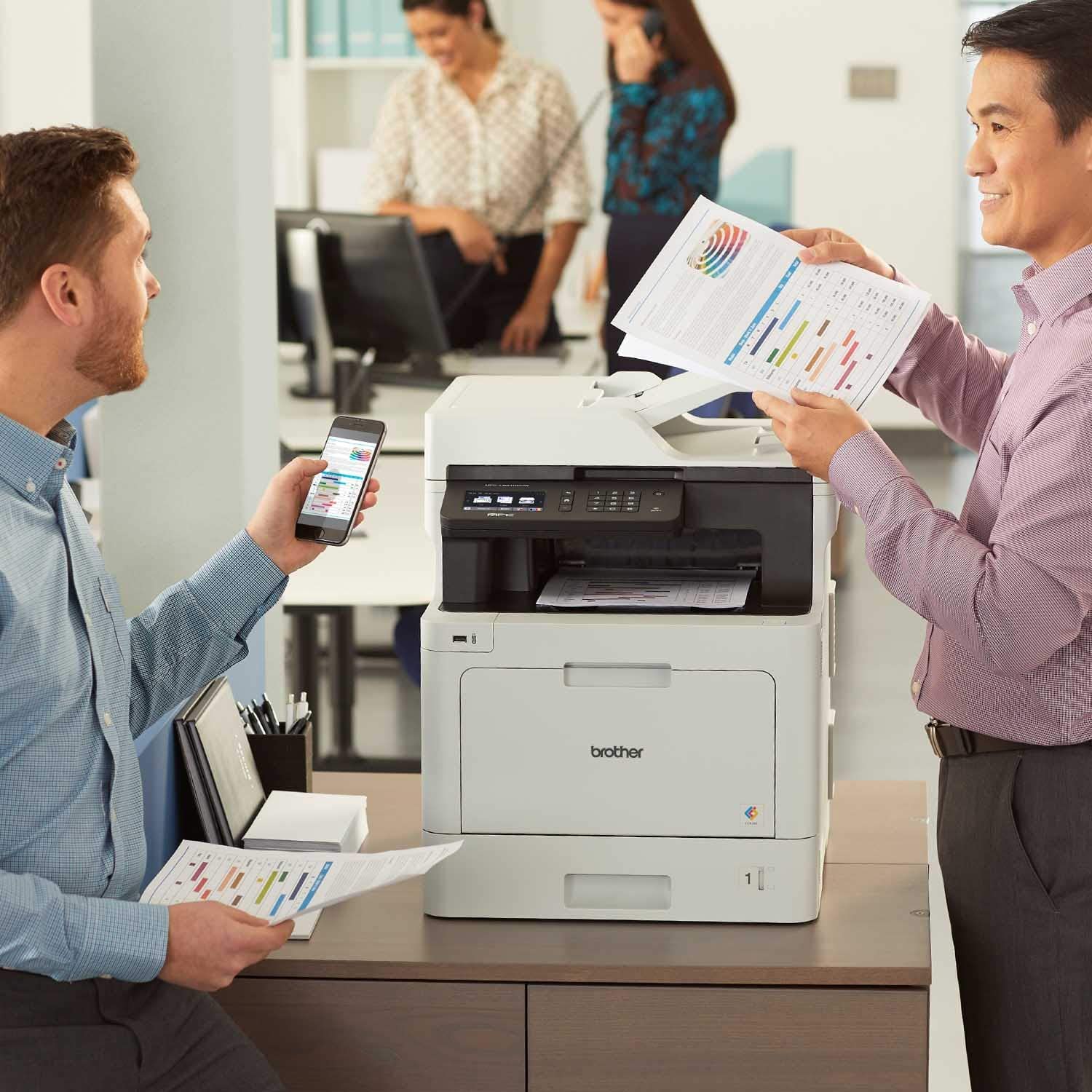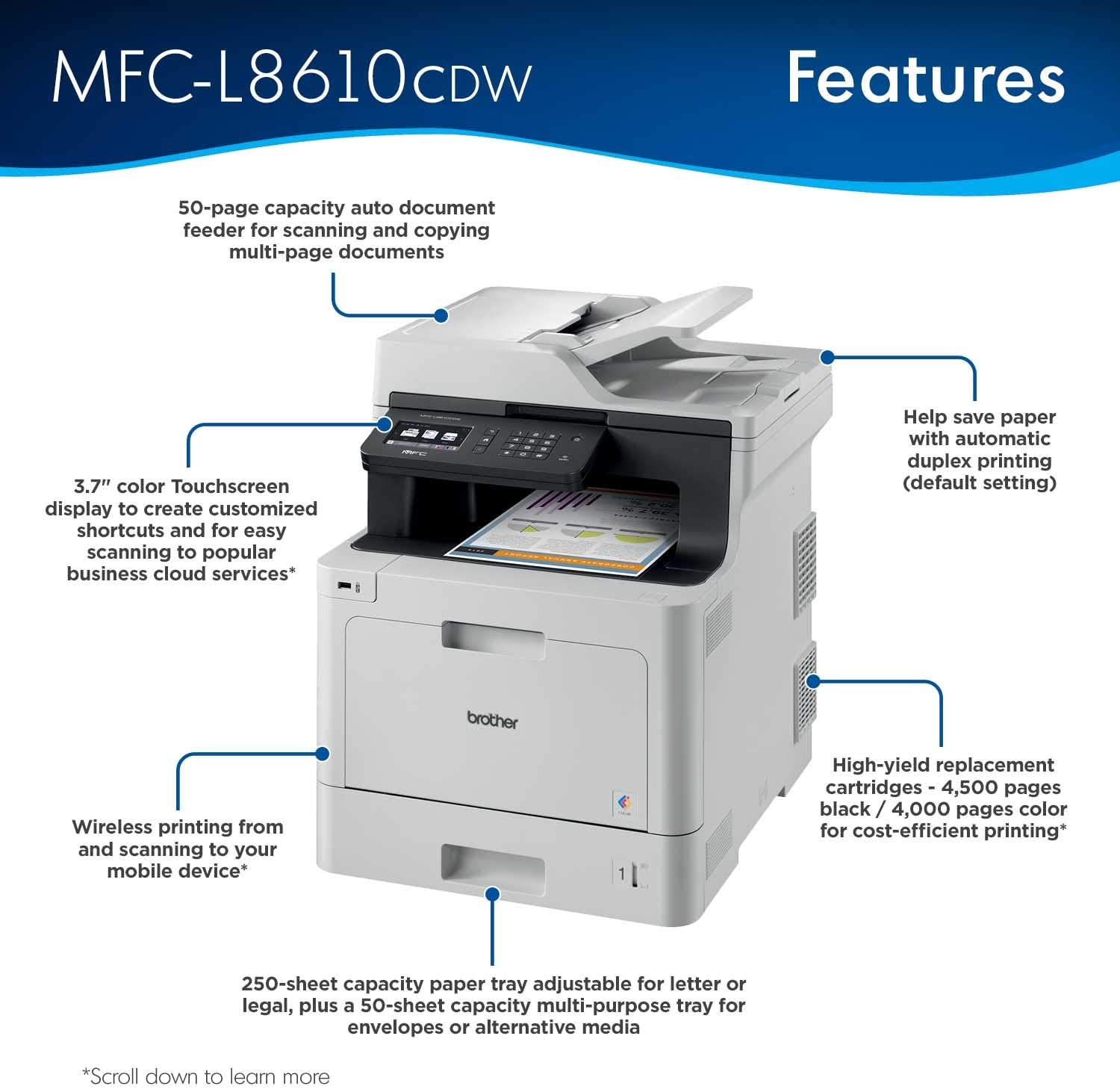 The Brother MFC-L8610CDW Color Laser All-in-One is a great choice for offices and small workgroups that need cost-efficient printing, easy scanning, secure document handling, and reliable, business-quality output. This color laser printer, copier, scanner, and fax machine was designed to enhance office productivity by delivering print speeds up to 33ppm(1) and scan speeds up to 29ipm. (6) The built-in scanning feature allows users to scan to popular destinations including e-mail, SharePoint, and business cloud services. (4) Connecting to the Brother MFC-L8610CDW is simple and convenient. Built-in wireless and Gigabit Ethernet network interfaces allow users to share the all-in-one. Plus, users can wirelessly print from a wide variety of mobile devices over a wireless network. An adjustable 3. 7″ Touchscreen display offers easy menu navigation and printing from and scanning to popular business Cloud services such as Google Drive, Dropbox, OneDrive, and more. (2) This Brother all-in-one offers a 50-page capacity automatic document feeder for copying, scanning and faxing multi-page documents. The adjustable 250-sheet capacity paper tray and 50-sheet capacity multipurpose tray make printing and copying simple. This office all-in-one can be upgraded to a 1, 050-sheet total capacity with optional trays. The MFC-L8610CDW is also Dash Replenishment enabled. This system allows the all-in-one to measure the toner level of your Genuine Brother Replacement Cartridges and automatically order replacements. This ensures you never run out of toner so that you can maintain the office efficiency you expect and require. (1)Based on one-sided printing. Change from default setting required. (2)Requires an Internet connection and an account with desired service. (3)Approximate cartridge yield in accordance with ISO/IEC 19798 (letter/A4). (4)Requires connection to a wireless network. (5)The mobile device must have NFC capability and run Android OS 4. 4 or later. (6)Scan speed measured with all advanced features turned off using LTR size test documents at 200dpi.