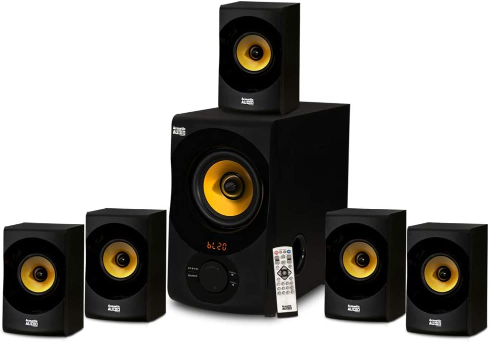 Acoustic Audio AA5172 700W Bluetooth Home Theater 5.1 Speaker System with FM Tuner, USB, SD Card, Remote Control, Powered Sub (6 Speakers, 5.1 Channels, Black with Gray)