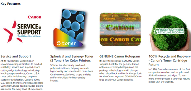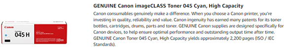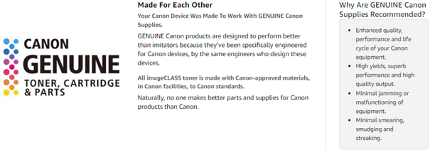 Canon consumables genuinely make a difference. When you choose a Canon printer, you’re investing in quality, reliability and value. Your Canon device was made to work with Genuine Canon supplies, and designed to perform better than imitators because they’ve been specifically engineered for Canon devices, by the same engineers who design these devices. Canon Genuine Toner helps you achieve enhanced quality, performance and life cycle of your Canon equipment. Naturally, no one makes better parts and supplies for Canon products than Canon.