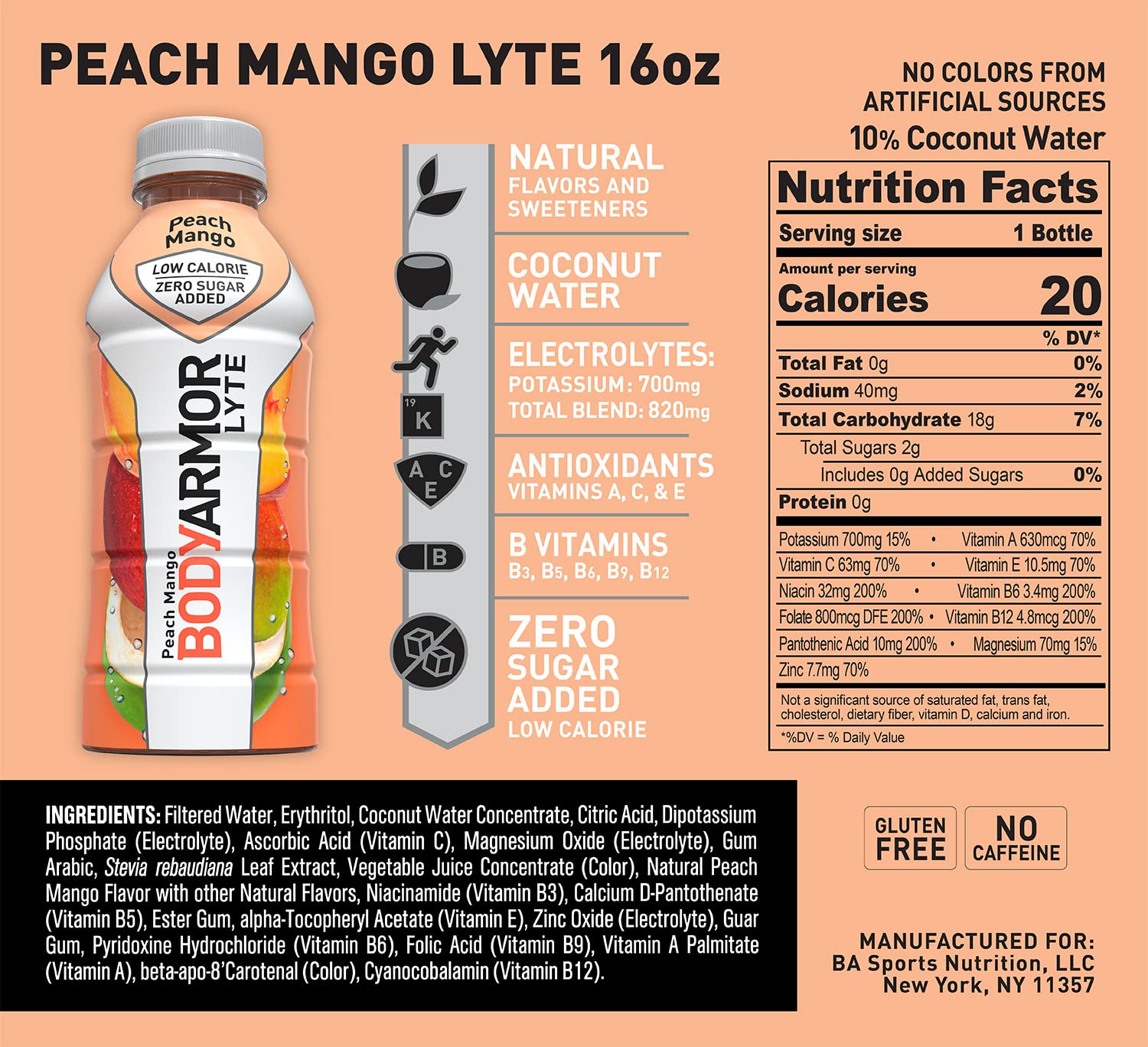 BODYARMOR LYTE Sports Drink Low-Calorie Sports Beverage, Peach Mango, Natural Flavors With Vitamins, Potassium-Packed Electrolytes, Perfect For Athletes, 16 Fl Oz (Pack of 12)