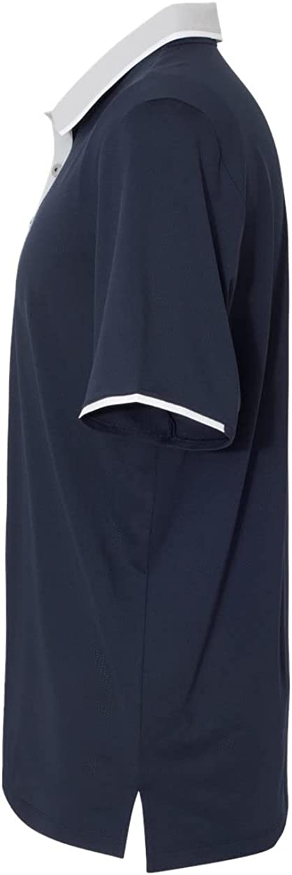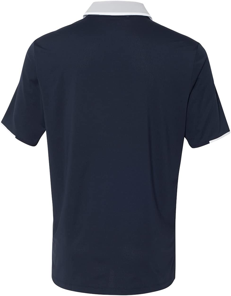 5.0 oz., 90/10 polyester/elastane,Two-color contrast woven collar,Hemmed set-in sleeves,Three-button placket,Moisture-management properties with underarm Climacool? inserts,Contrast adidas performance heat-transfer logo on right sleeve,